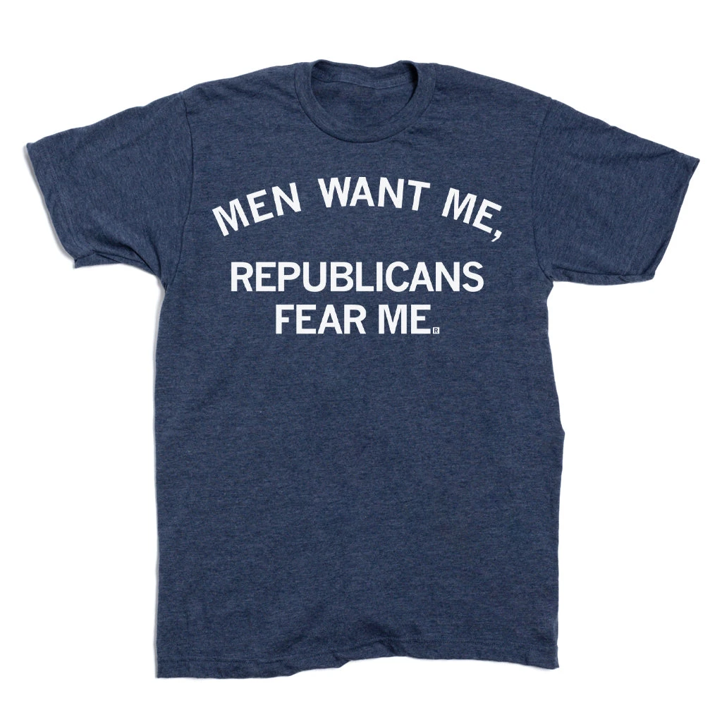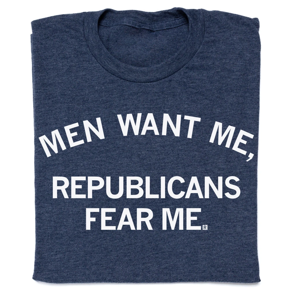 Men Want Me, Republicans Fear Me. A Portion of All RAYGUN Sales Raise Money For Organizations That We Support. White Screen Print on a Heather Denim T-shirt (50% Combed Ringspun Cotton / 50% Polyester). Cut & sewn sweatshop free. Designed and Printed by Union Labor at RAYGUN.