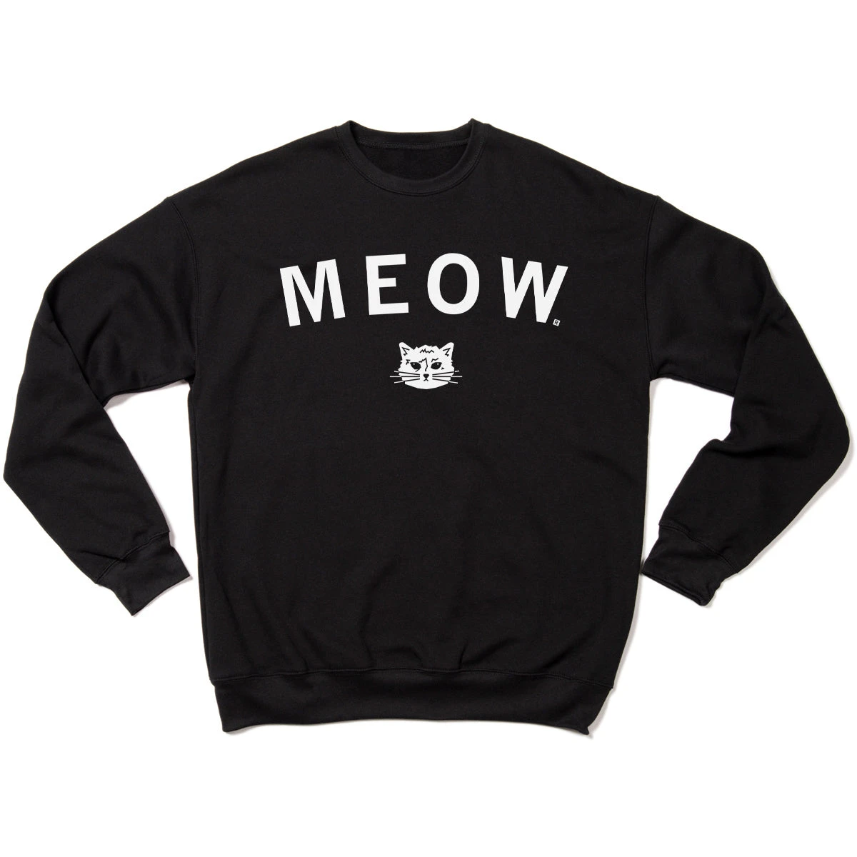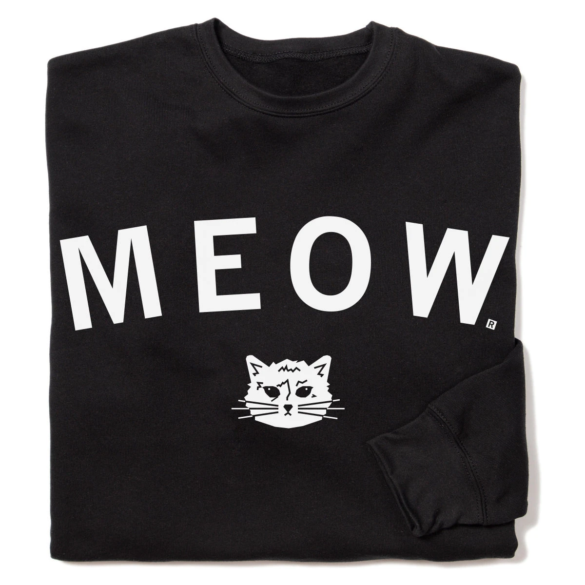 Meow. A Portion of All RAYGUN Sales Raise Money For Organizations That We Support. White Screen Print on a Black Crew Sweatshirt (75% Combed Ringspun Cotton / 25% Polyester). Cut & sewn sweatshop free. Designed and Printed by Union Labor at RAYGUN.