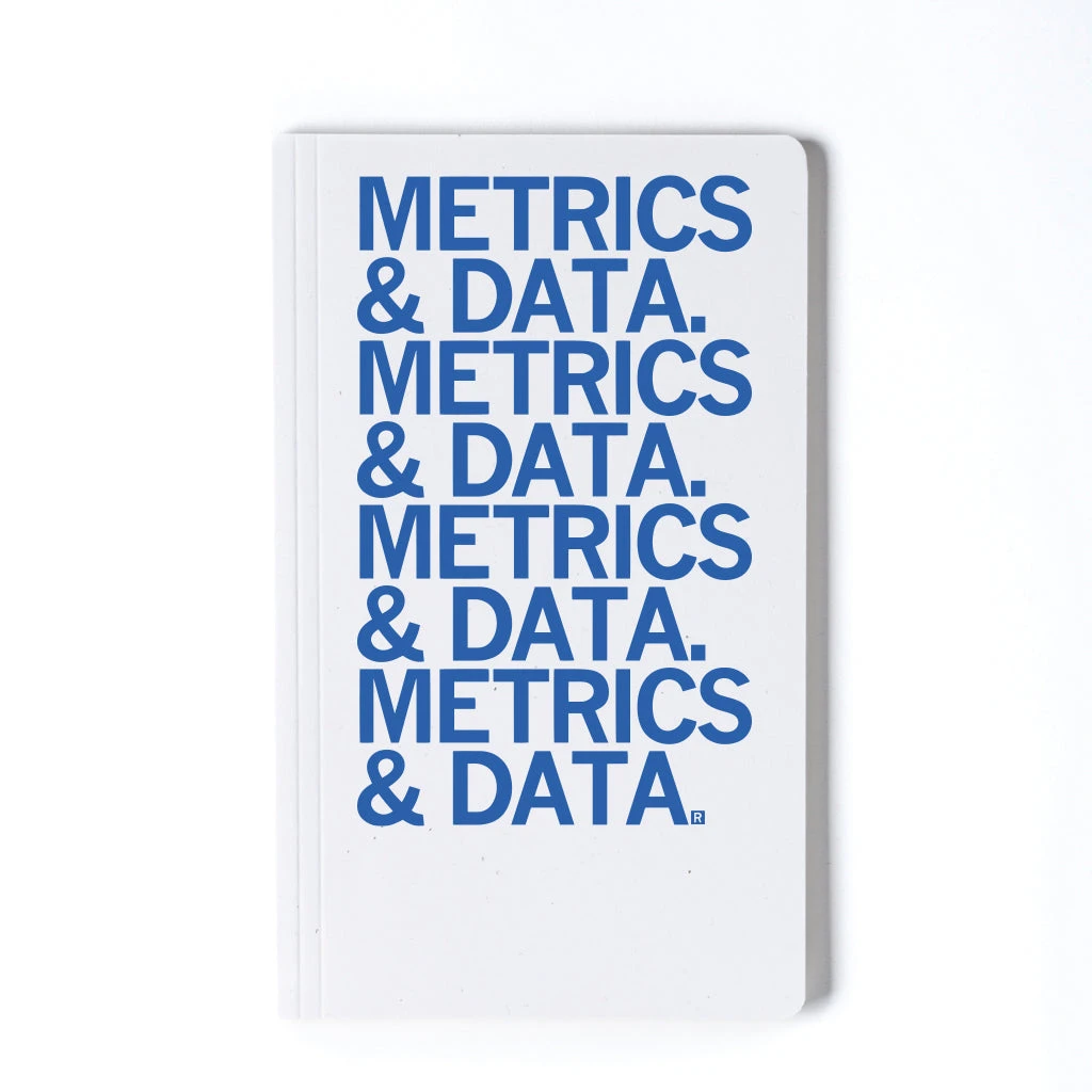 Metrics & data & metrics & data. Cobalt Blue Screen Print on Unlined paper made in the USA, and dimensions 5.5″ x 8.5″. Designed by RAYGUN and printed by Union Labor at RAYGUN. Assembled using union labor at Garner Printing in Des Moines, IA.