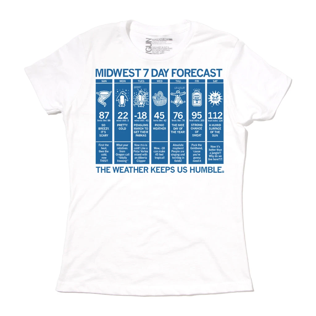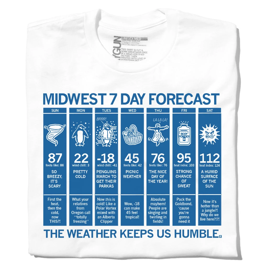 Midwest 7 Day Forecast the Weather Keeps us Humble. A Portion of All RAYGUN Sales Raise Money For Organizations That We Support. Mono Blue Screen Print on White T-shirt (100% Combed Ringspun Cotton). Cut and sewn sweatshop free. Designed and printed by Union Labor at RAYGUN.