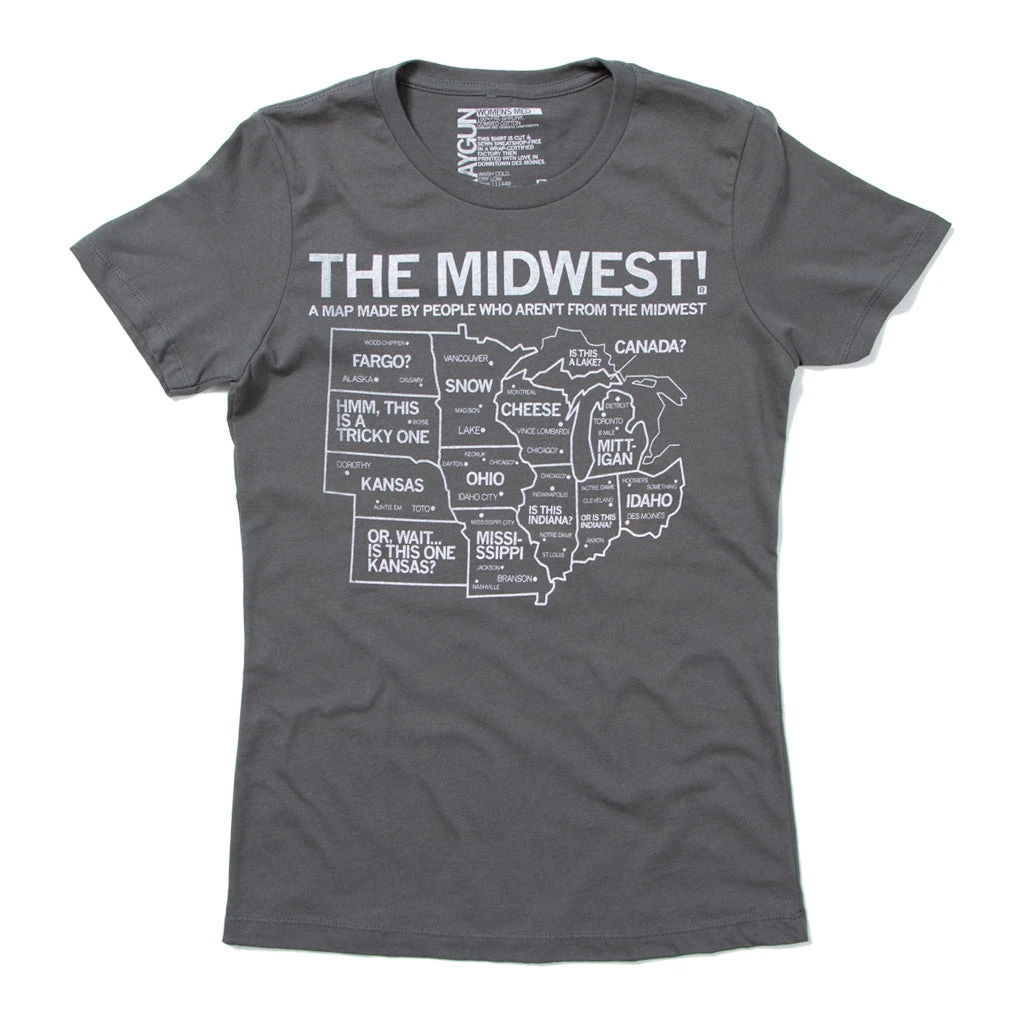 A Map of The Midwest By People Who Aren’t From The Midwest. A Portion of All Raygun Sales Raise Money For Organizations That We Support. White Screen Print on a Heavy Metal T-shirt (100% Combed Ringspun Cotton). Cut and sewn sweatshop free. Designed and printed by Union Labor at RAYGUN.