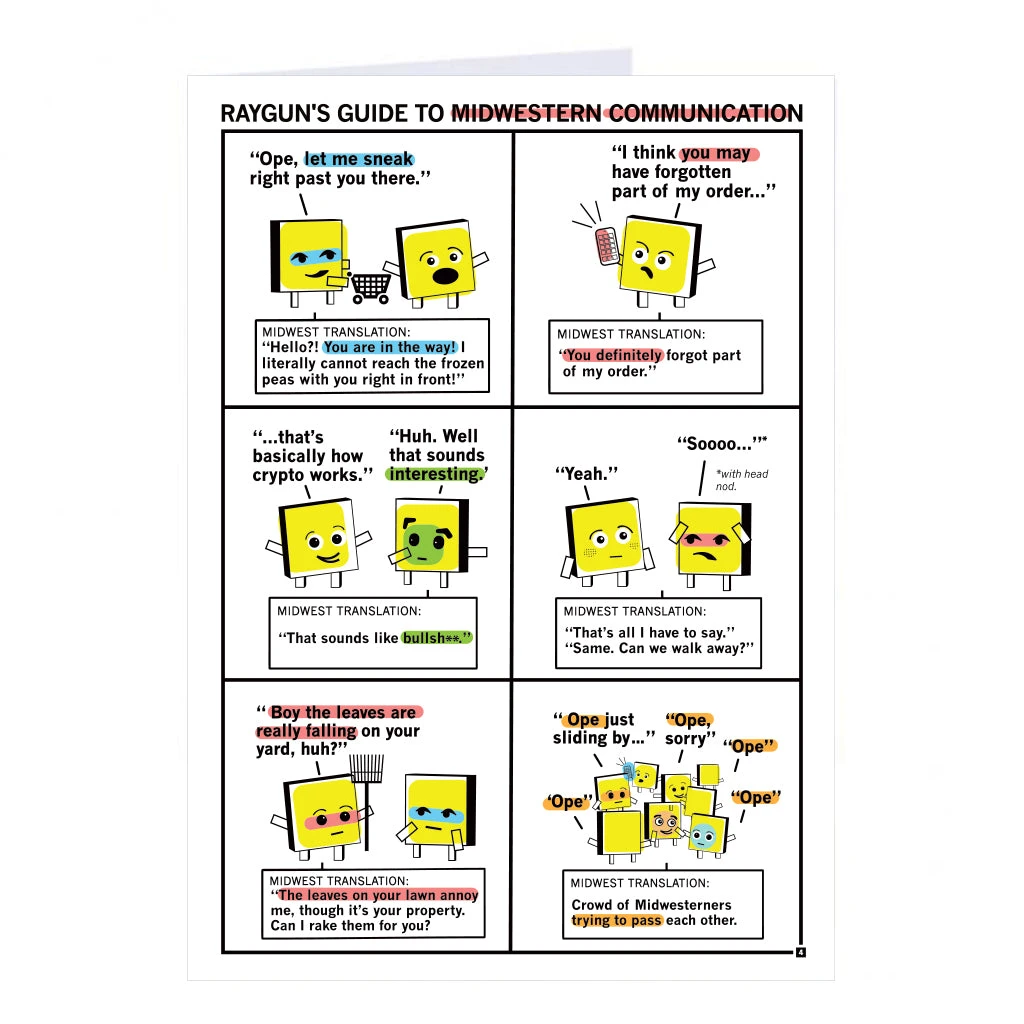 RAYGUN’s Guide to Midwestern Communication. A Portion of All RAYGUN Sales Raise Money For Organizations That We Support. 5″ x 7″ Folded Greeting Card. Inside of the card is blank and envelope included. Designed by RAYGUN and printed by union labor at Garner Printing in Des Moines, IA.