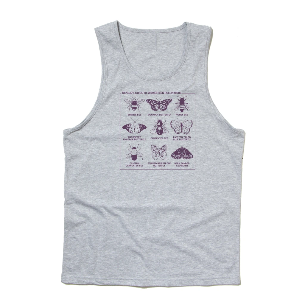 RAYGUN’s Guide To: Midwestern Pollinators. RAYGUN is a monthly supporter of the ELPC Midwest, Iowa Environmental Council, and many other pollinator-friendly gardens. Pollinator Purple Screen Print on a Heather Grey Tank Top. (90% Combed and Ringspun Cotton / 10% Polyester). Cut and sewn sweatshop free. Designed and printed by Union Labor at RAYGUN.