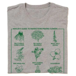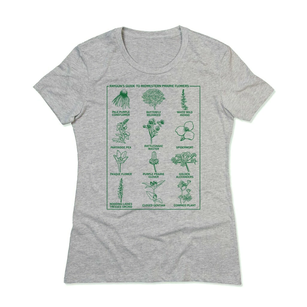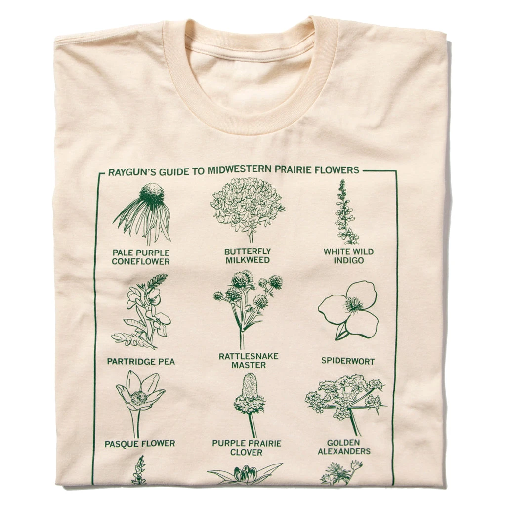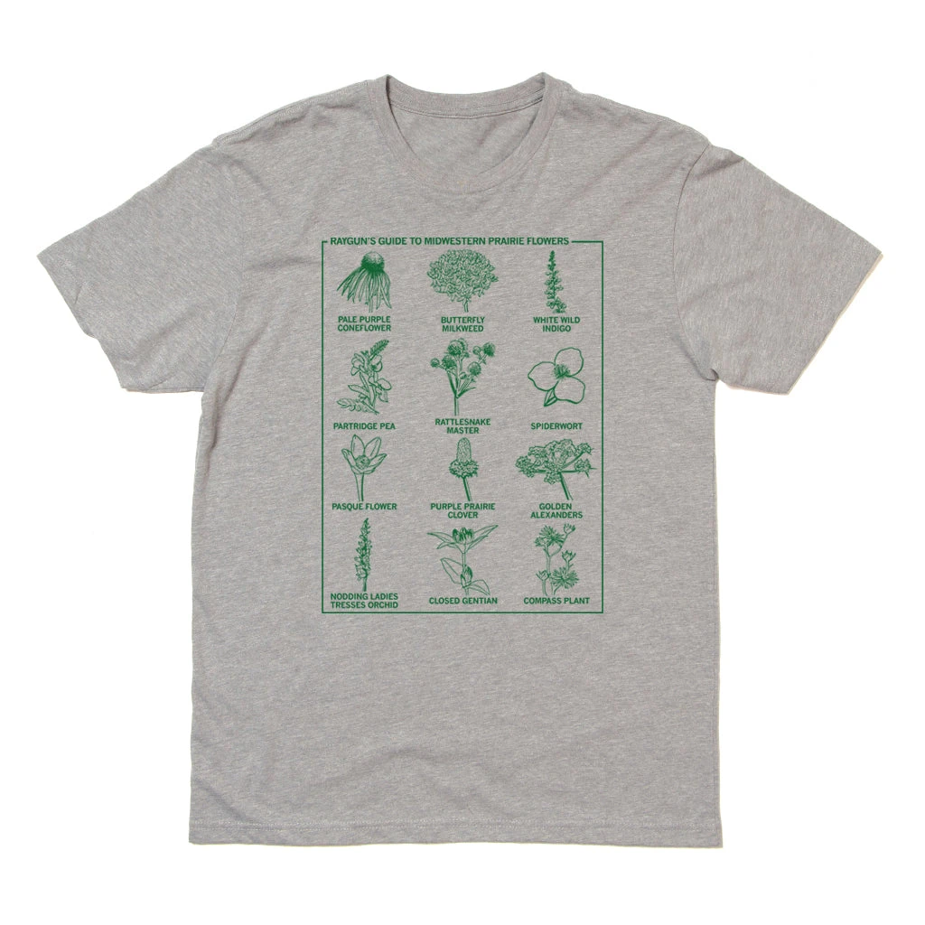 RAYGUN’s Guide To: Midwestern Prairie Flowers. Some proceeds benefit the Iowa Praire Network. Prairie Green Screen Print on a Creme T-shirt (100% Combed and Ringspun Cotton) or a Heather Grey T-shirt (65% Polyester / 35% Combed Ringspun Cotton). Cut and sewn sweatshop free. Designed and printed by Union Labor at RAYGUN.