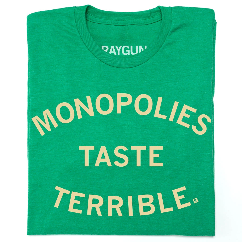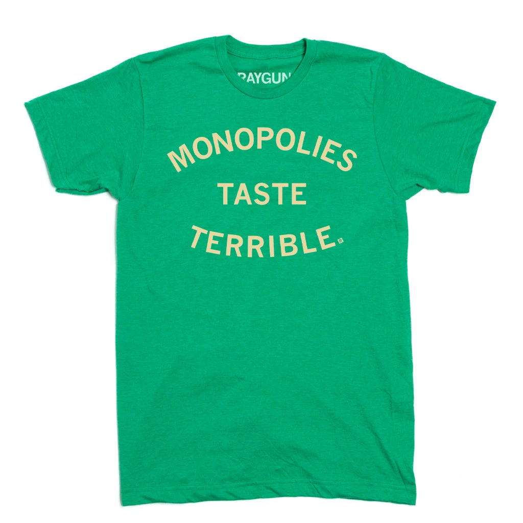 Monopolies taste terrible. A Portion of All RAYGUN Sales Raise Money For Organizations That We Support. Khaki Screen Print on a Heather Kelly Green T-shirt (50% Combed Ringspun Cotton / 50% Polyester) Cut & sewn sweatshop free. Designed and Printed by Union Labor at RAYGUN.