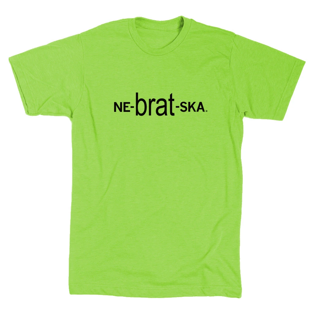 Nebraska is Ne-BRAT-ska. Get it? Idea inspired by Annie DiRusso who may be the first to coin this term while performing at Grrrlcamp. A Portion of All RAYGUN Sales Raise Money For Organizations That We Support. Black Screen Print on a Lime Green DryBlend T-shirt (50% Cotton / 50% Polyester). Cut & sewn sweatshop free. Designed and Printed by Union Labor at RAYGUN.