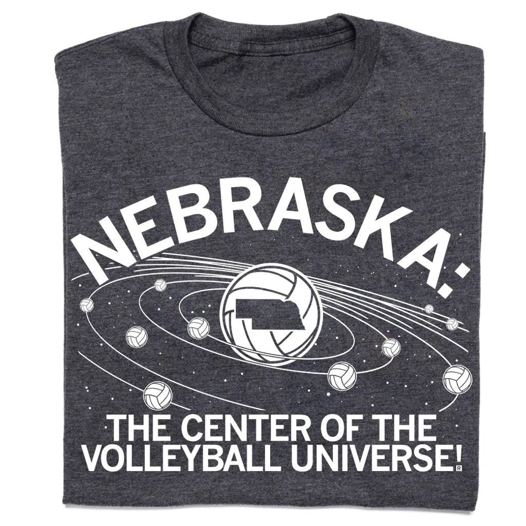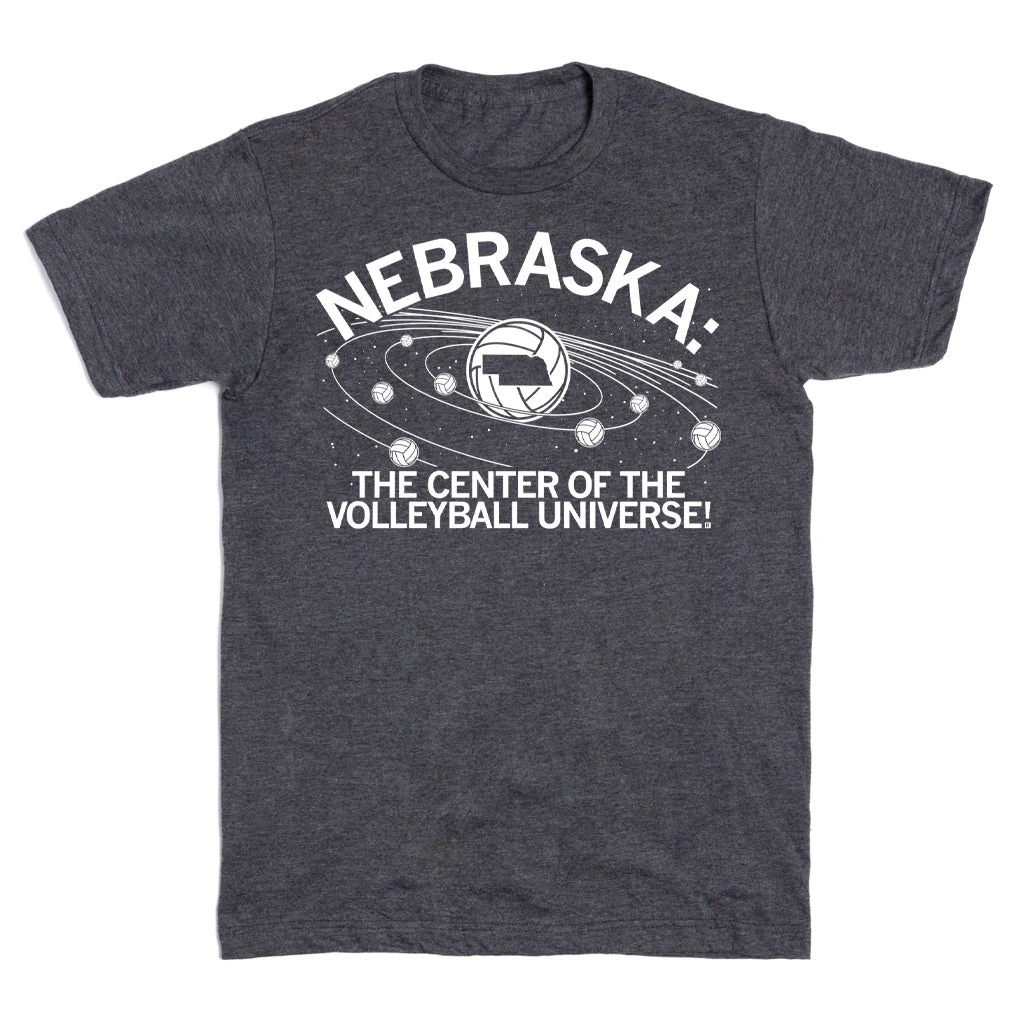 Nebraska: The Center Of The Volleyball Universe. A Portion of All RAYGUN Sales Raise Money For Organizations That We Support. White Screen Print on a Charcoal T-shirt (50% Combed Ringspun Cotton / 50% Polyester). Cut and sewn sweatshop free. Designed and printed by Union Labor at RAYGUN!