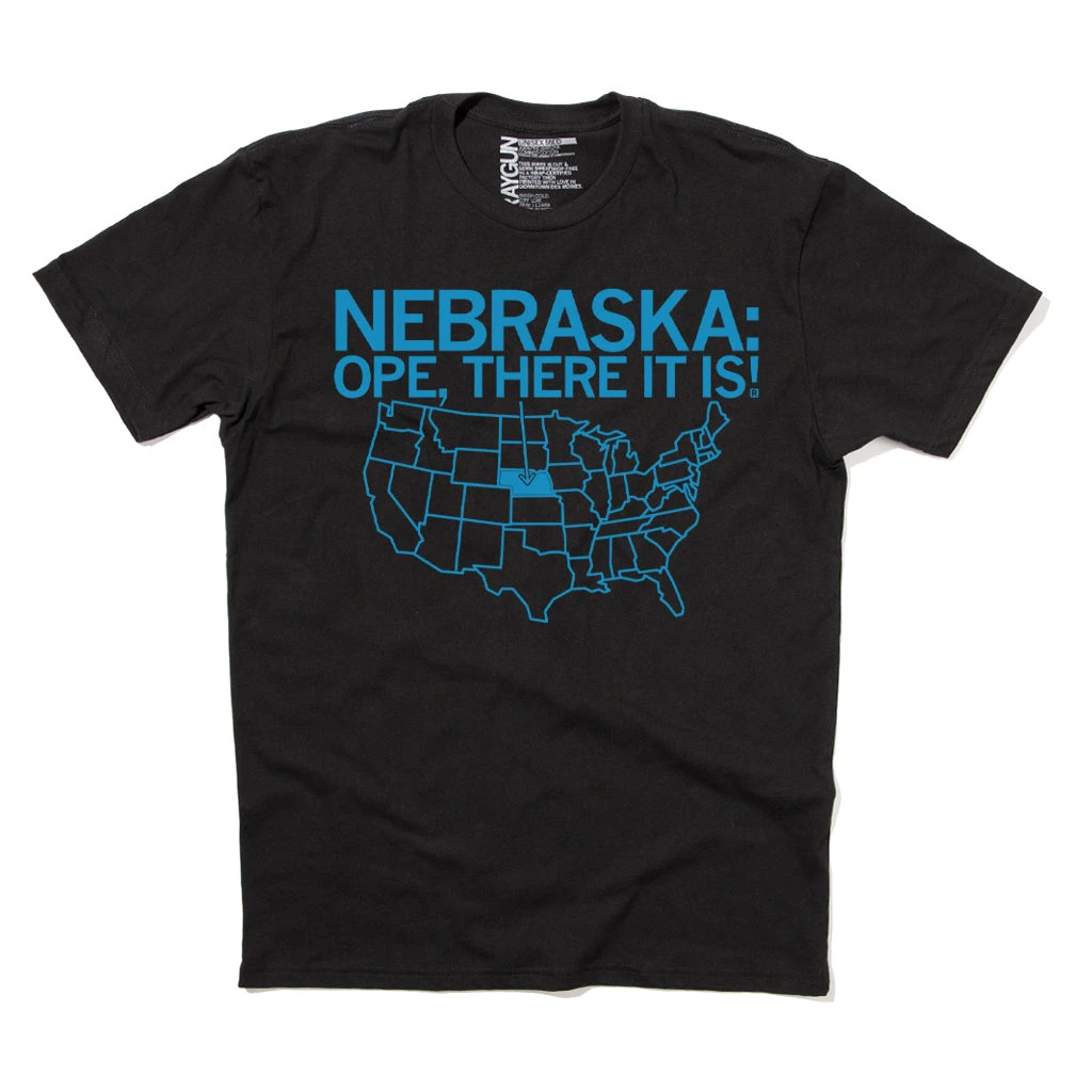 Nebraska: Ope, There It Is! A Portion of All RAYGUN Sales Raise Money For Organizations That We Support. Bright Blue Screen Print on a Black T-shirt (100% Combed ringspun cotton). Cut and sewn sweatshop free. Designed and printed by Union Labor at RAYGUN.