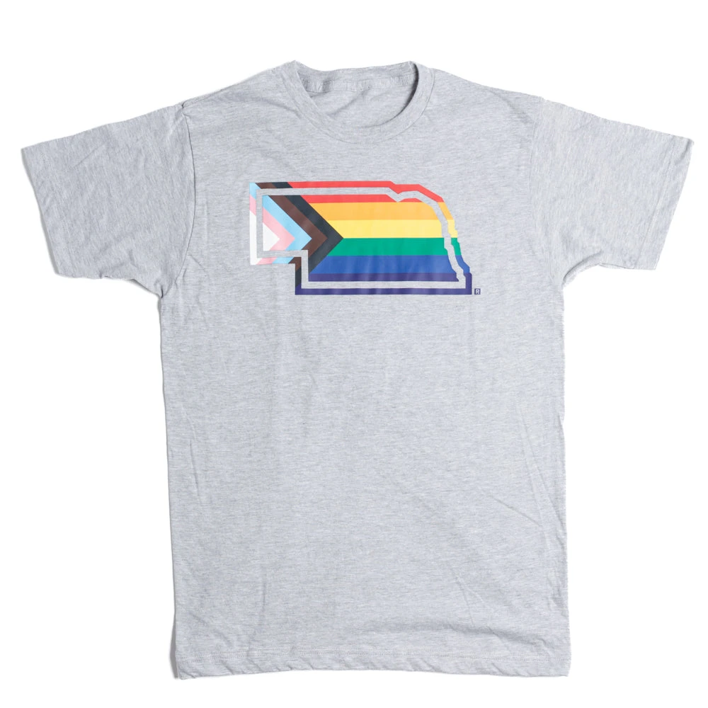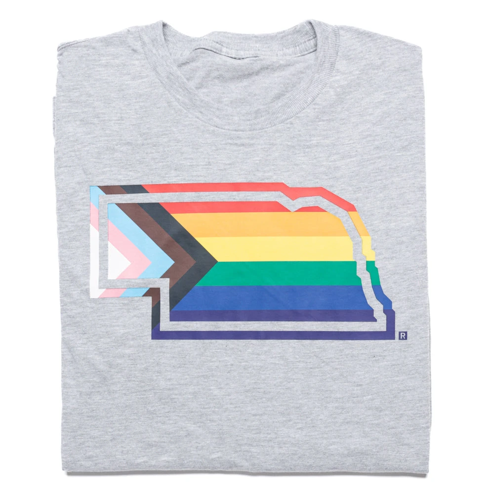 Nebraska has Pride. A Portion of All RAYGUN Sales Raise Money For Organizations That We Support. Heat Transfer on a Light Grey T-shirt (90% Combed Ringspun Cotton / 10% Polyester). Cut and sewn sweatshop free. Designed and printed by Union Labor at RAYGUN.