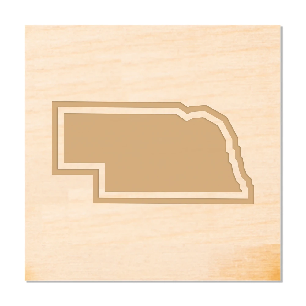Nebraska State Outline. Laser Etch on 1/8 inch Baltic Birch wood. 4×4″ clear sealed and back stained black. Designed by RAYGUN and printed by Union Labor at RAYGUN.