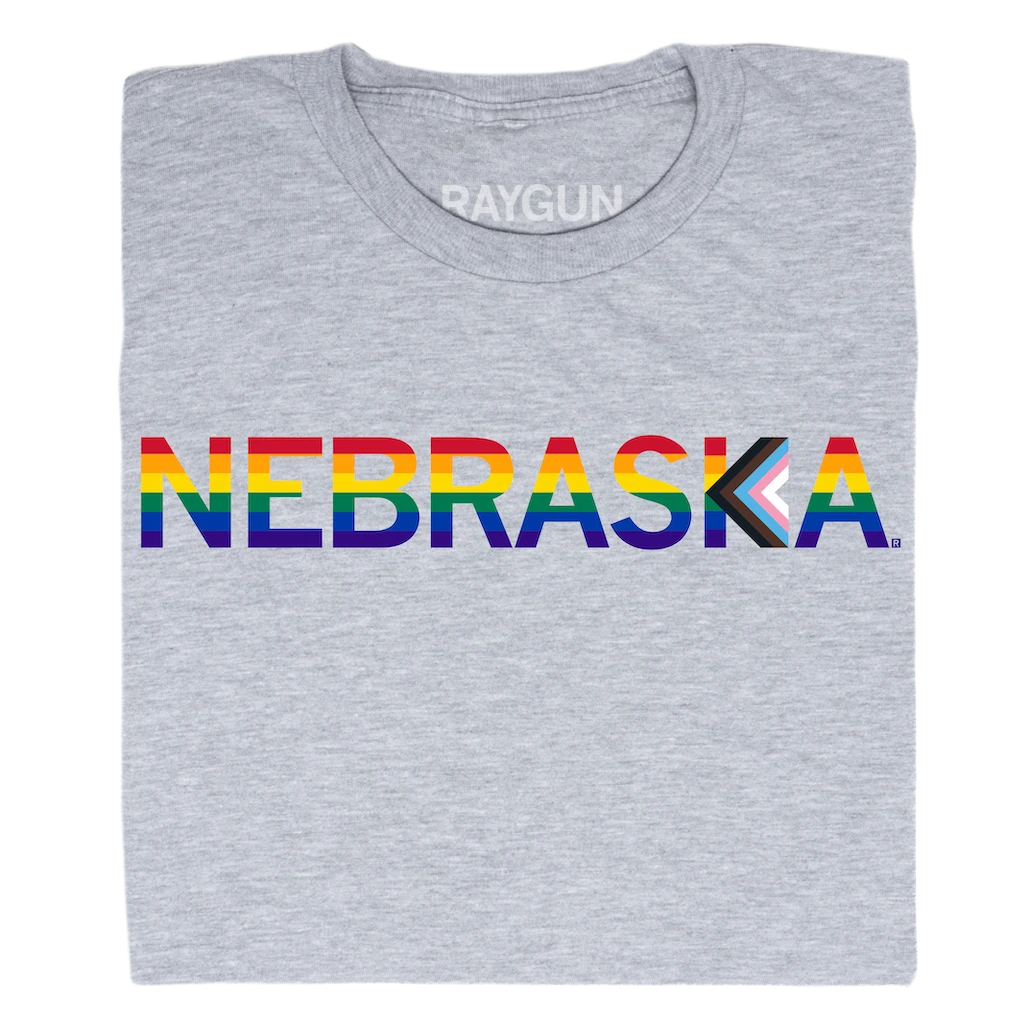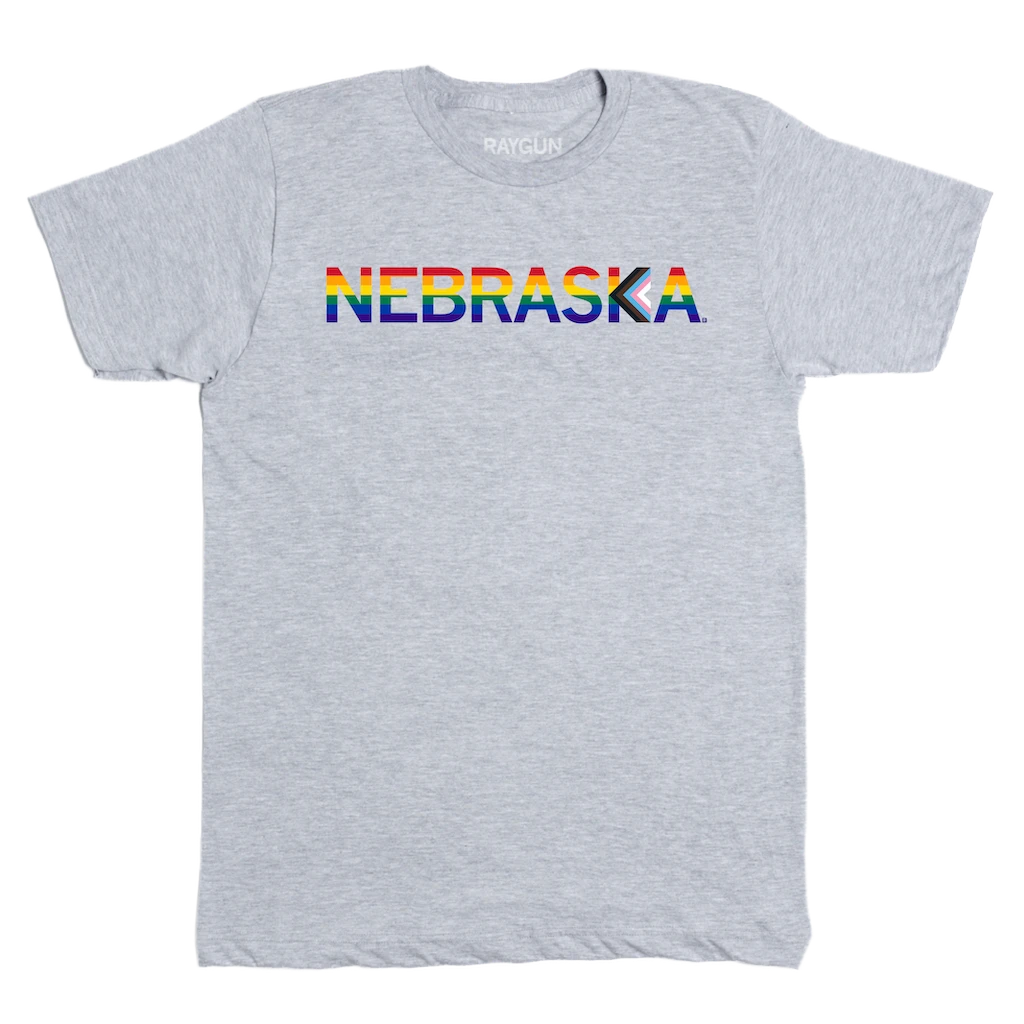 Nebraska has Pride. A Portion of All RAYGUN Sales Raise Money For Organizations That We Support. Heat Transfer on a Light Grey T-shirt (90% Combed Ringspun Cotton / 10% Polyester). Cut and sewn sweatshop free. Designed and printed by Union Labor at RAYGUN.