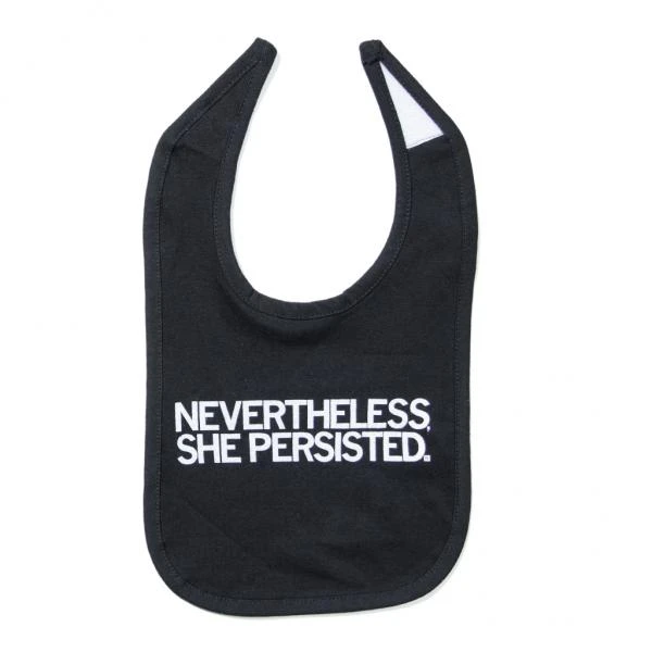 Nevertheless, Elizabeth Warren Persisted. White Screen Print on a Black Bib (100% Cotton). Cut and sewn sweatshop free. Designed and printed by Union Labor at RAYGUN.