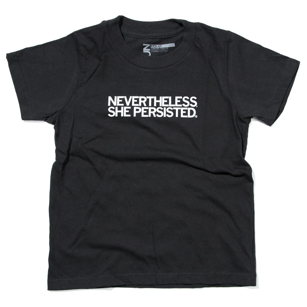 Nevertheless, Elizabeth Warren Persisted. Proceeds from this shirt benefit She Should Run. White Screen print on Black T-shirt (100% Combed Ringspun Cotton). Cut and sewn sweatshop free. Designed and printed by Union Labor at RAYGUN.