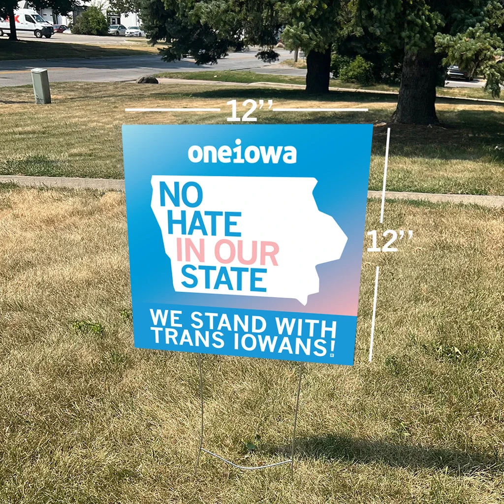No hate in our state! We stand with trans Iowans! 100% of Profits go to One Iowa. Single-Sided 12″ x 12″ Chloroplast Yard Sign with 10″ x 14″ Metal Stake. Designed by RAYGUN and made in Des Moines, IA.