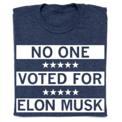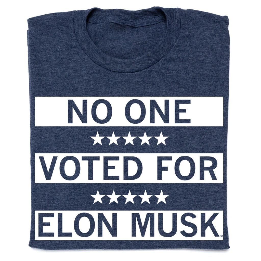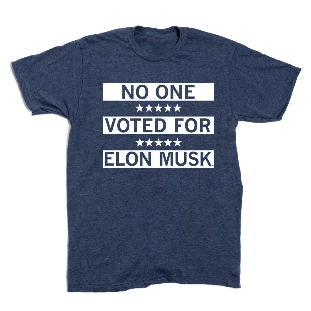 No one voted for Elon Musk. A Portion of All RAYGUN Sales Raise Money For Organizations That We Support. White Screen Print on a Heather Denim T-shirt (50% Combed Ringspun Cotton / 50% Polyester). Cut & sewn sweatshop free. Designed and Printed by Union Labor at RAYGUN.