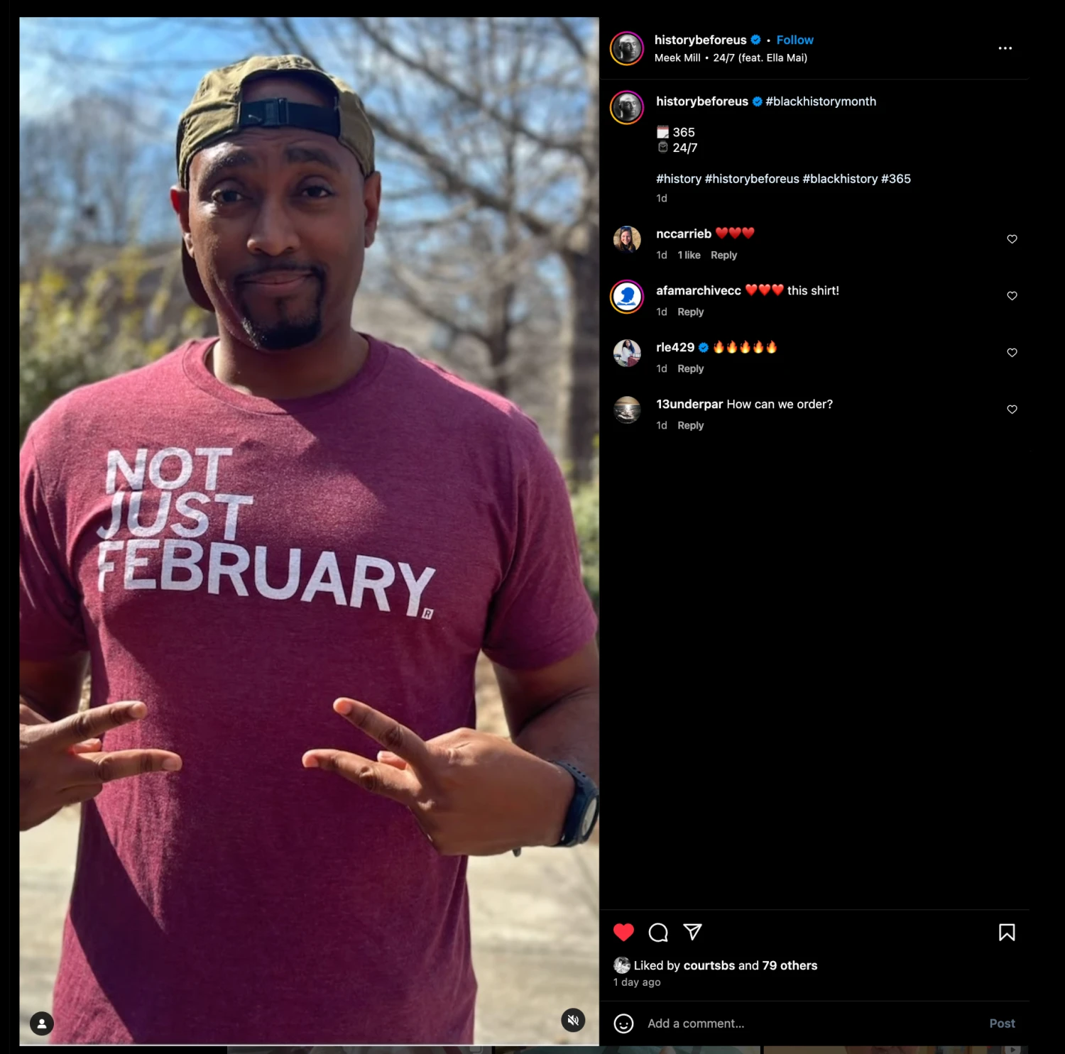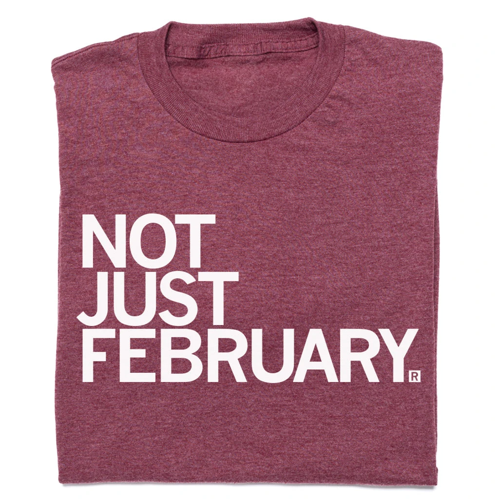 Not Just February. A portion of sales goes towards our ongoing support to the NAACP as well as African American Museums in our local areas. White Screen Print on a Heather Burgundy T-shirt (50% Combed Ringspun Cotton / 50% Polyester). Cut and sewn sweatshop free. Designed and printed by Union Labor at RAYGUN.