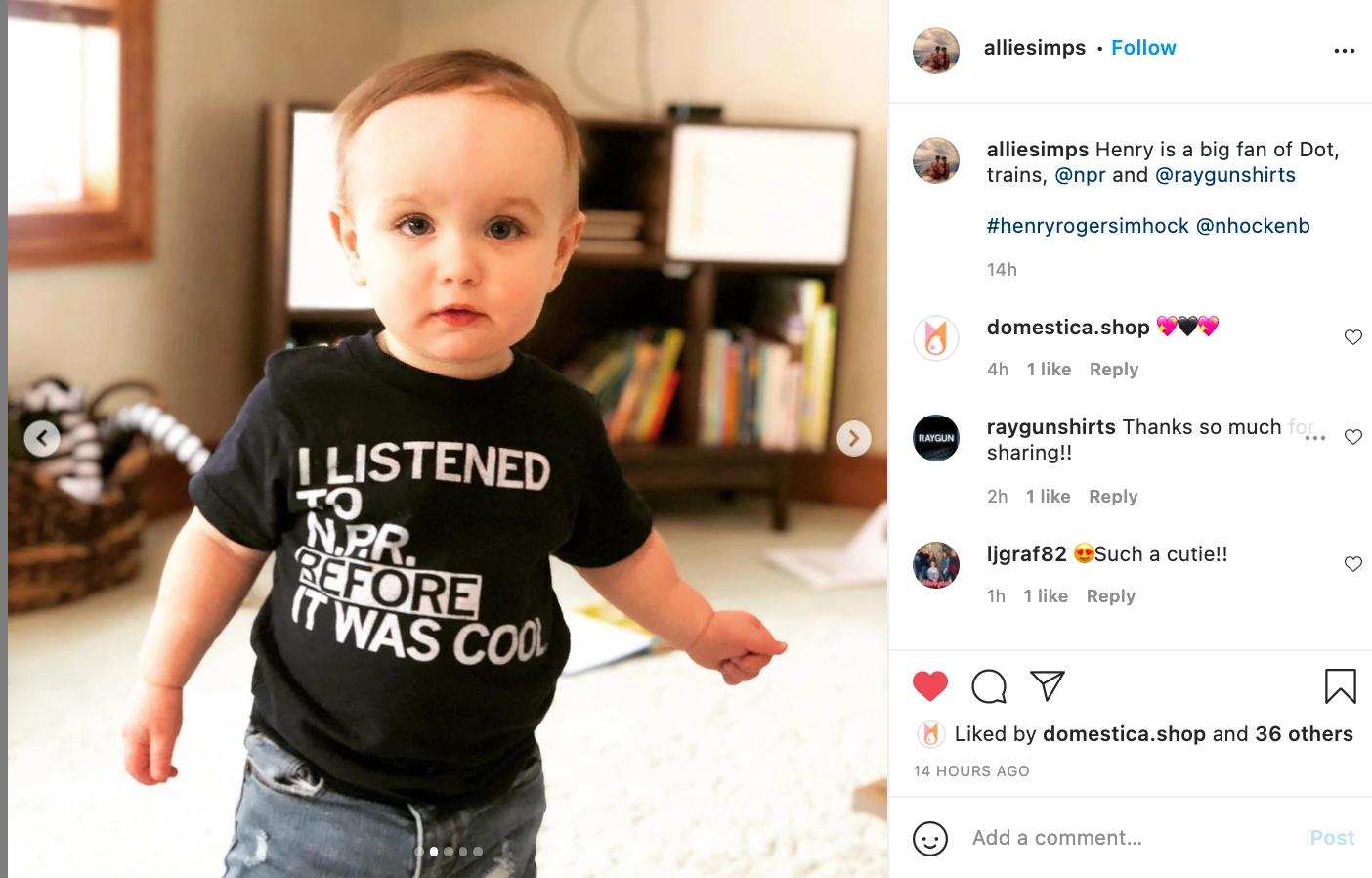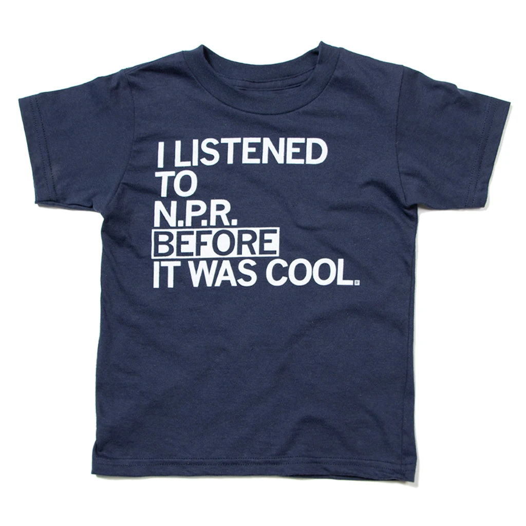 I Listened To NPR Before It Was Cool. White Screen Print on a Heather Navy T-shirt (60% Combed Ringspun Cotton / 40% Polyester). Cut and sewn sweatshop free. Designed and printed by Union Labor at RAYGUN.