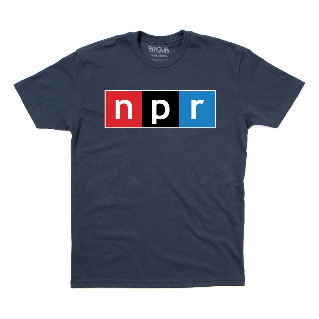 Square National Public Radio Logo. Officially licensed with NPR, meaning a portion of sales goes to support programming. More RAYGUN designed or printed products are available at NPR.org. Red, Black, Blue, & White Screen Print on a Navy T-shirt (100% Combed Ringspun Cotton). Cut & sewn sweatshop free. Designed and Printed by Union Labor at RAYGUN.