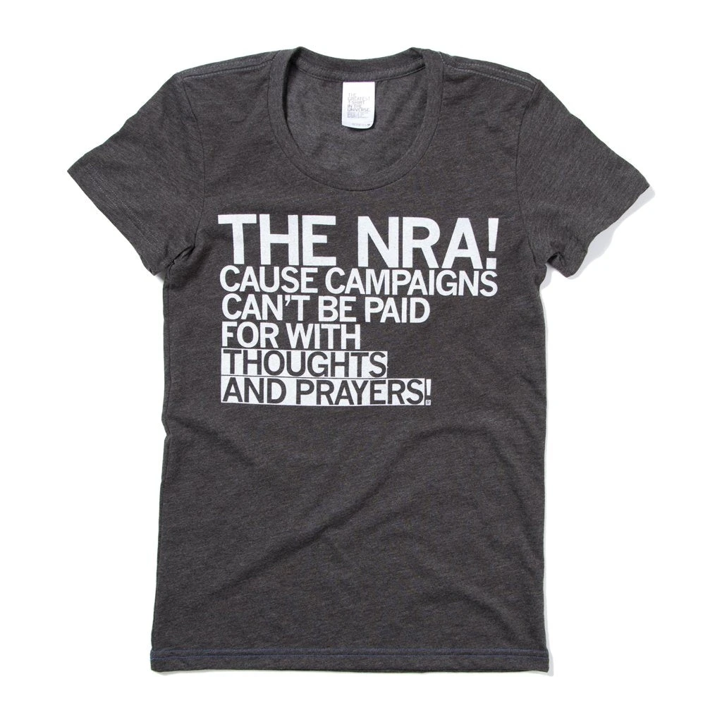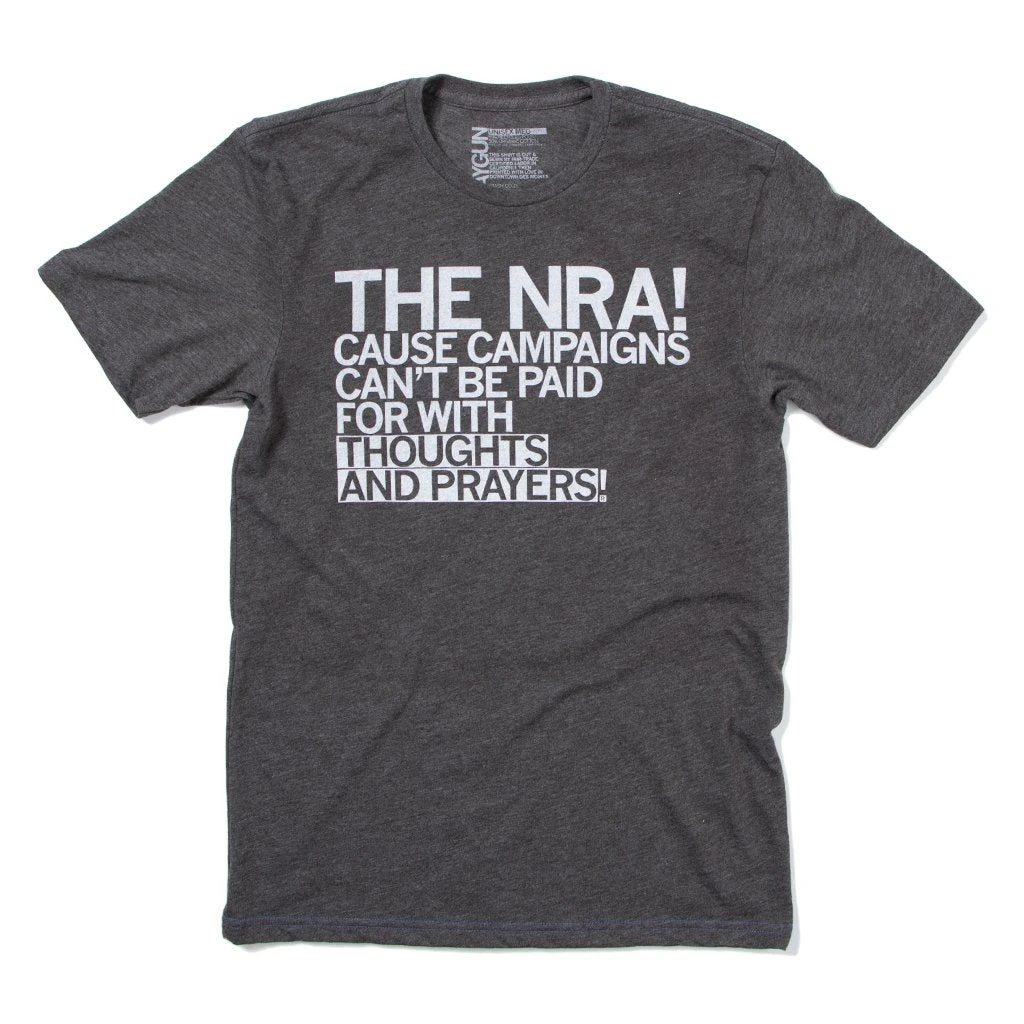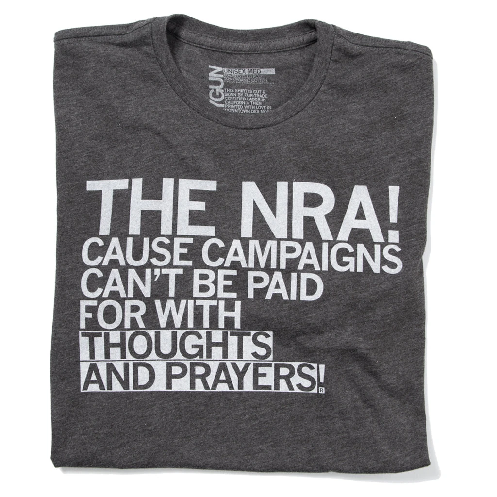 Because Campaigns Can’t Be Paid For With Thoughts And Prayers. A portion of sales go to efforts being made for sensible gun laws. Personally we support Giffords Law Center To Prevent Gun Violence. This Design Has Been Retired and is No Longer Available on Our Sales Floors But Can Be Ordered Here Online! Since All of Our Retired Designs Are Printed on Demand, Please Allow For a Couple Extra Days Before Shipping. White Screen print on a Charcoal T-shirt (50% Combed Ringspun Cotton / 50% Polyester). Cut and sewn sweatshop free. Designed and printed by Union Labor at RAYGUN.