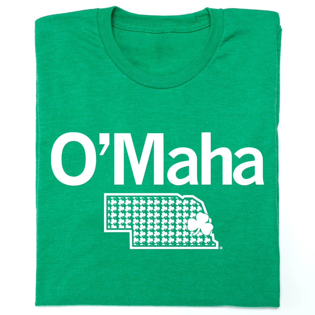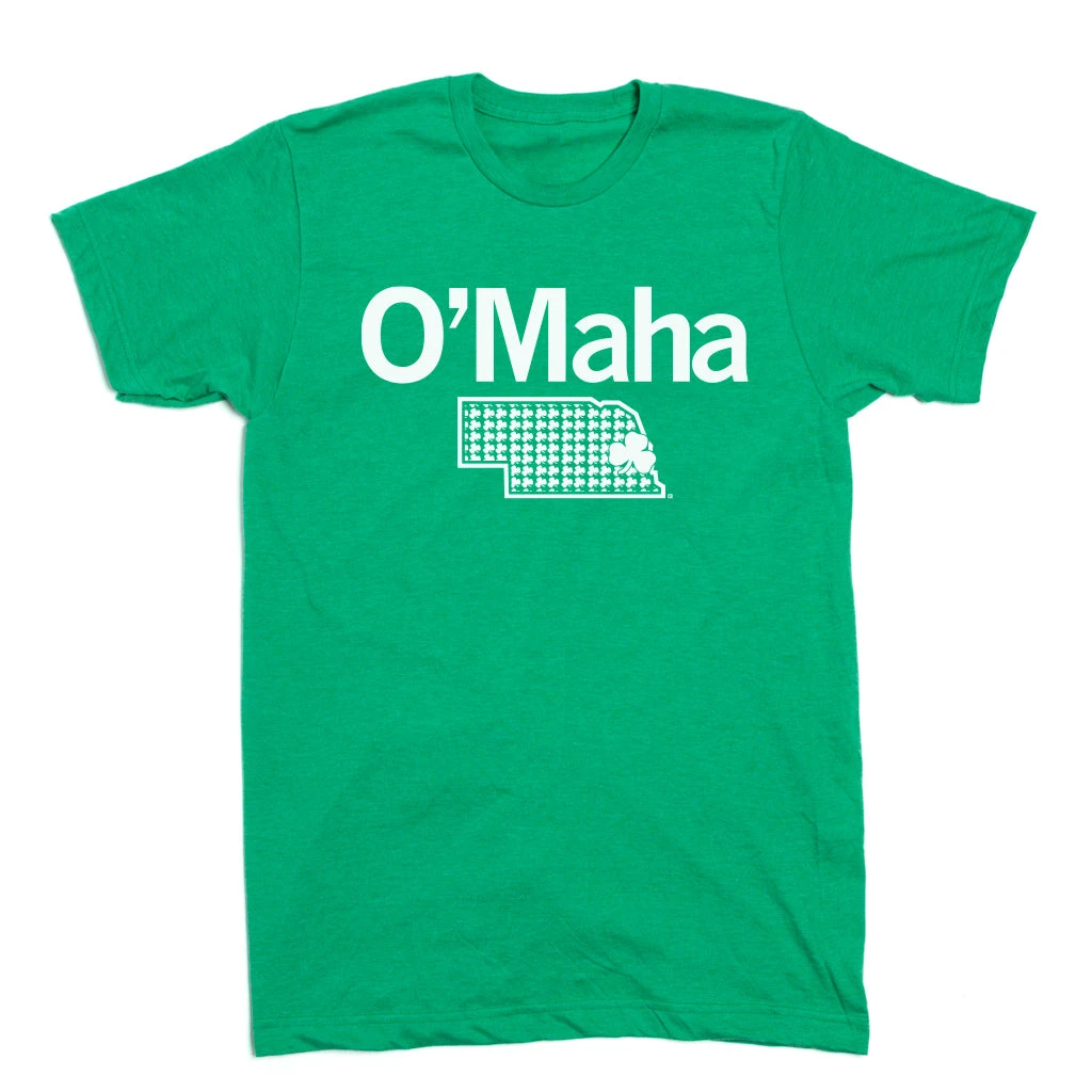 O’ Maha, Omaha. A Portion of All RAYGUN Sales Raise Money For Organizations That We Support. White Screen Print on a Heather Kelly Green T-shirt (50% Combed Ringspun Cotton / 50% Polyester). Cut & sewn sweatshop free. Designed and printed by Union Labor at RAYGUN.