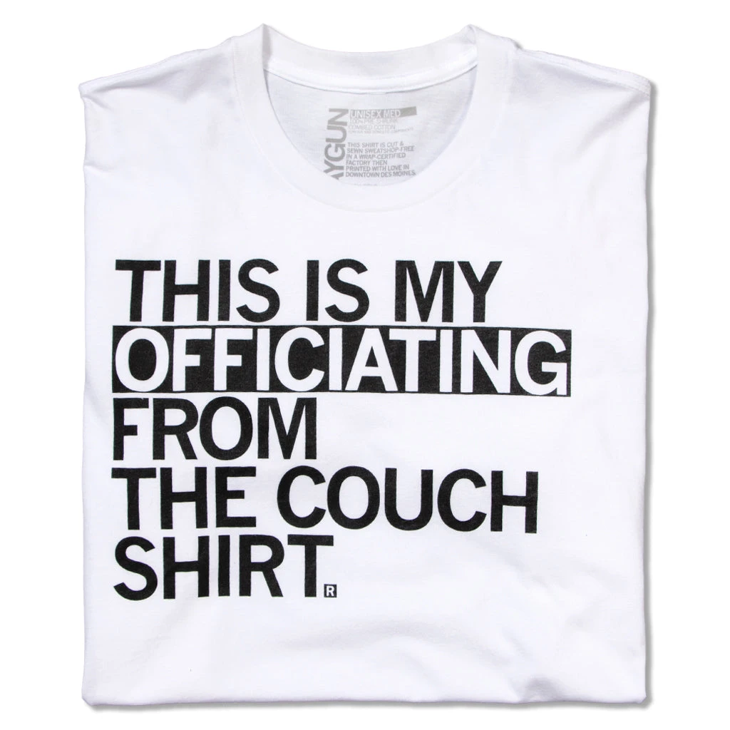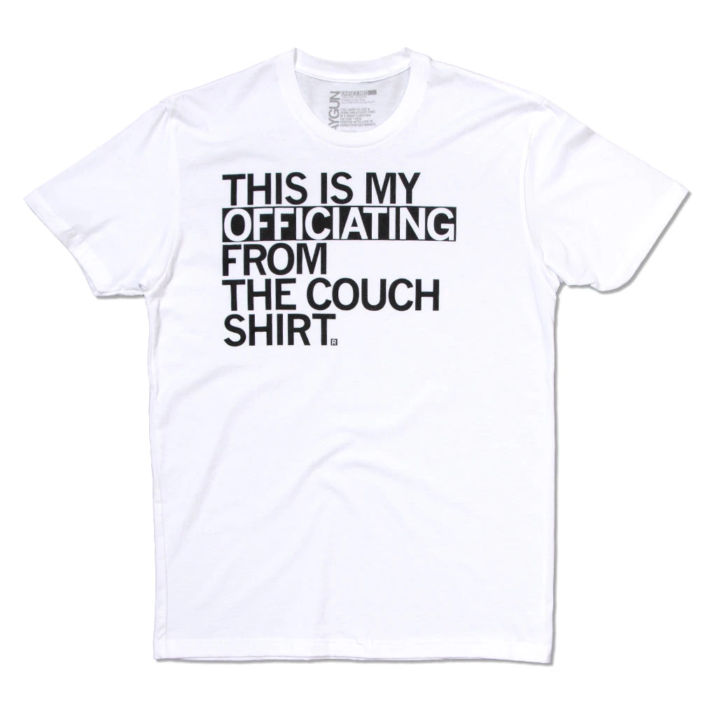 This Is My Officiating From The Couch Shirt. We’ve brought this design back from the dead! As part of our Retired Design collection, you can now order this classic RAYGUN tee once again. Since we print this design on demand, please allow up to two weeks for delivery. A Portion of All RAYGUN Sales Raise Money For Organizations That We Support. Black Screen Print on a White T-shirt (100% Combed Ringspun Cotton). Cut and sewn sweatshop free. Designed and printed by Union Labor at RAYGUN.
