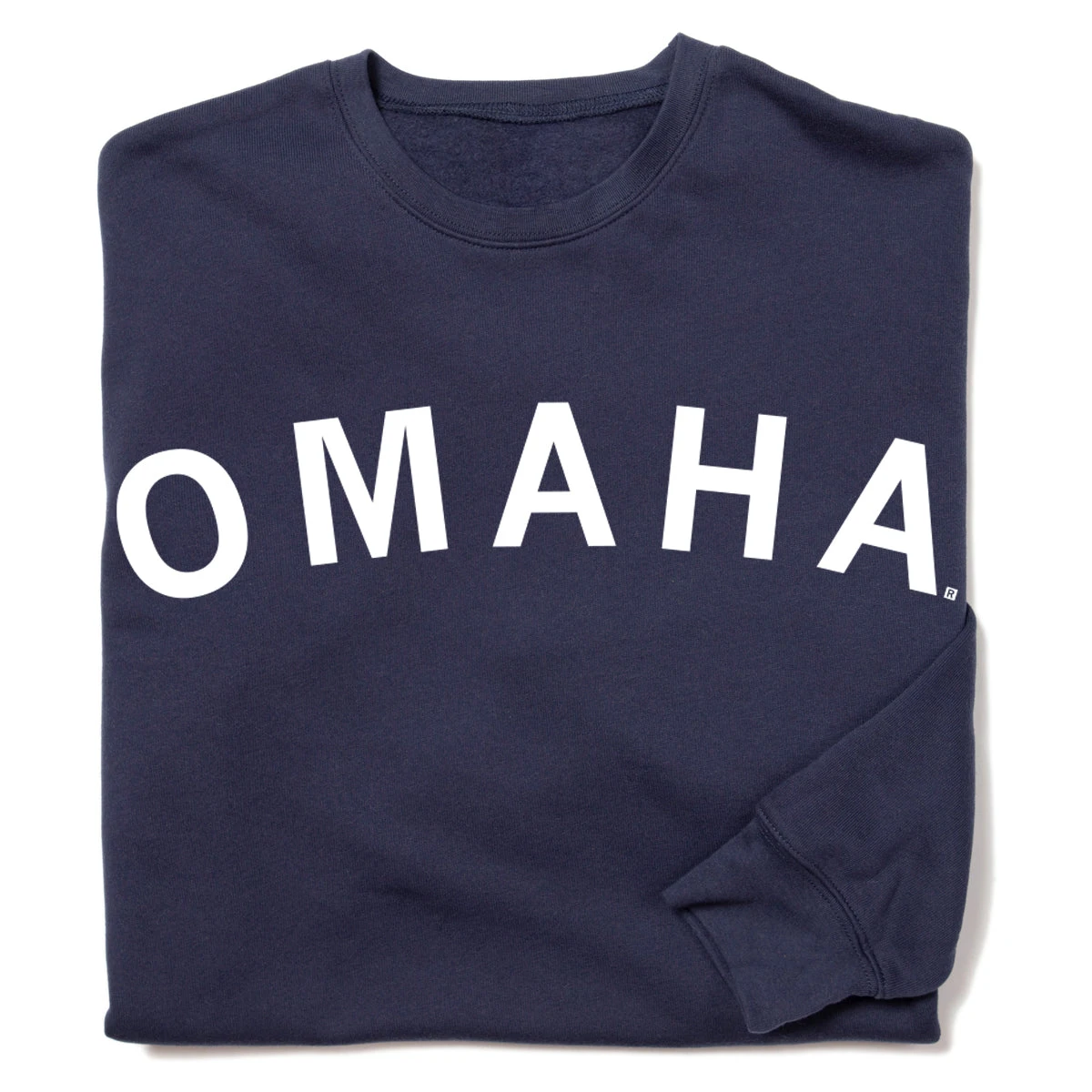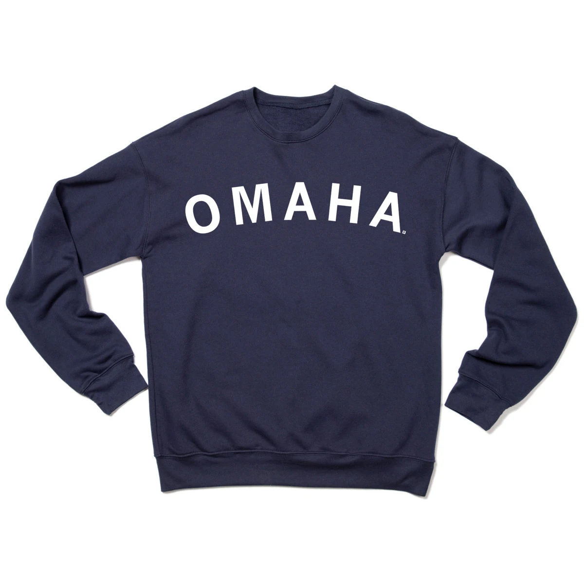 Omaha, Nebraska. A Portion of All RAYGUN Sales Raise Money For Organizations That We Support. White Screen Print on a Heather Navy Crew Sweatshirt (80% Combed Ringspun Cotton / 20% Polyester). Cut and sewn sweatshop free. Designed and printed by Union Labor at RAYGUN.