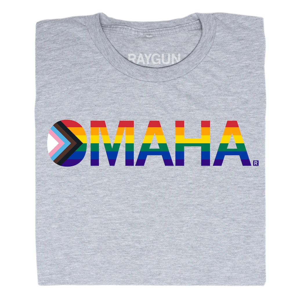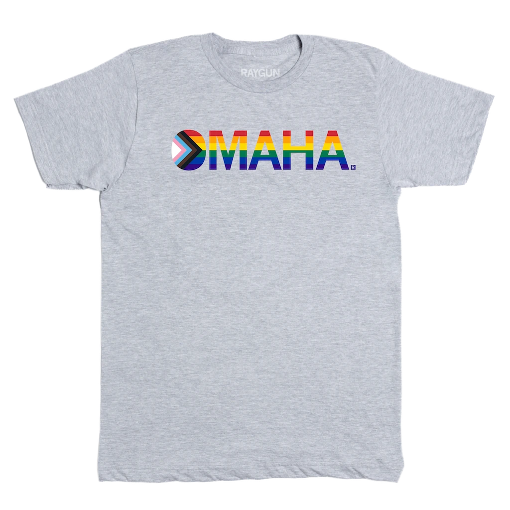 Omaha, NE has Pride. A Portion of All RAYGUN Sales Raise Money For Organizations That We Support. Heat Transfer on a Light Grey T-shirt (90% Combed Ringspun Cotton / 10% Polyester). Cut and sewn sweatshop free. Designed and printed by Union Labor at RAYGUN.