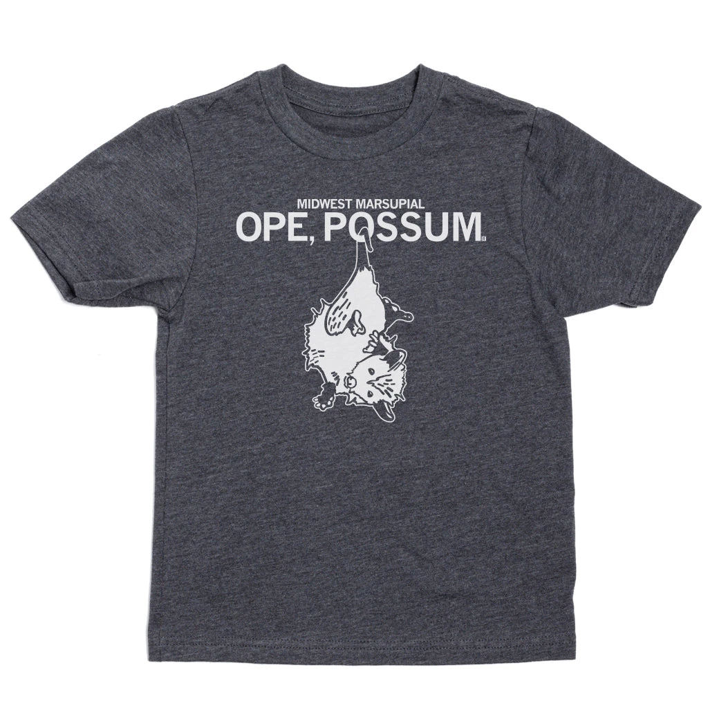 Midwestern Marsupial: Ope, Possum. A Portion of All RAYGUN Sales Raise Money For Organizations That We Support. White Screen Print on a Charcoal T-shirt (60% Combed Ringspun Cotton / 40% Polyester). Cut and sewn sweatshop free. Designed and printed by Union Labor at RAYGUN.