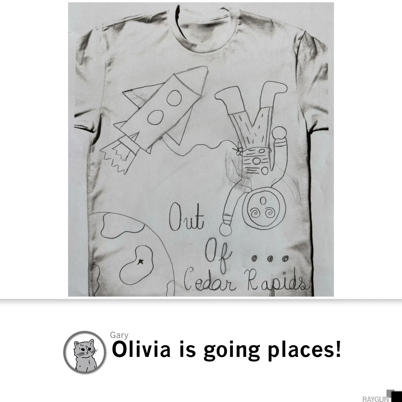 Out of . . . Cedar Rapids. NewBo STEAM Saturdays Design Winner! A Portion of All RAYGUN Sales Raise Money For Organizations That We Support. White Screen Print on a Black T-Shirt (100% Combed Ringspun Cotton). Cut and sewn sweatshop free. Designed and printed by Union Labor at RAYGUN.