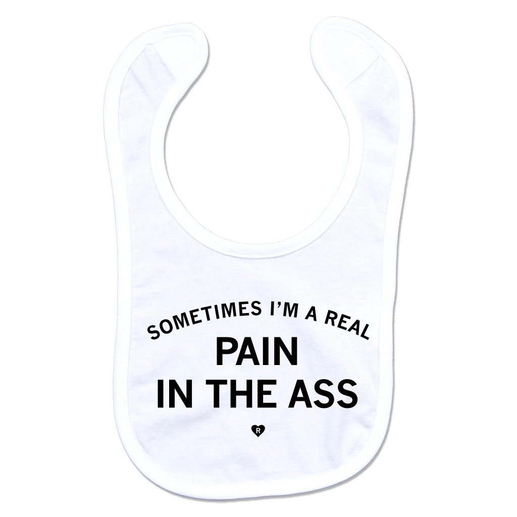Sometimes I’m a real pain in the ass. A Portion of All RAYGUN Sales Raise Money For Organizations That We Support. Black Screen Print on a White Bib (100% Baby Rib Cotton). Cut and sewn sweatshop free. Designed and printed by Union Labor at RAYGUN.