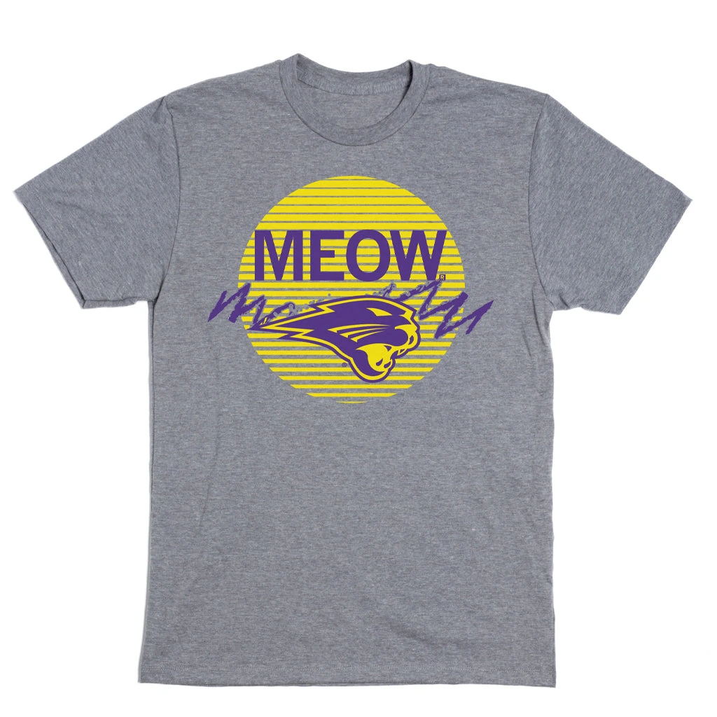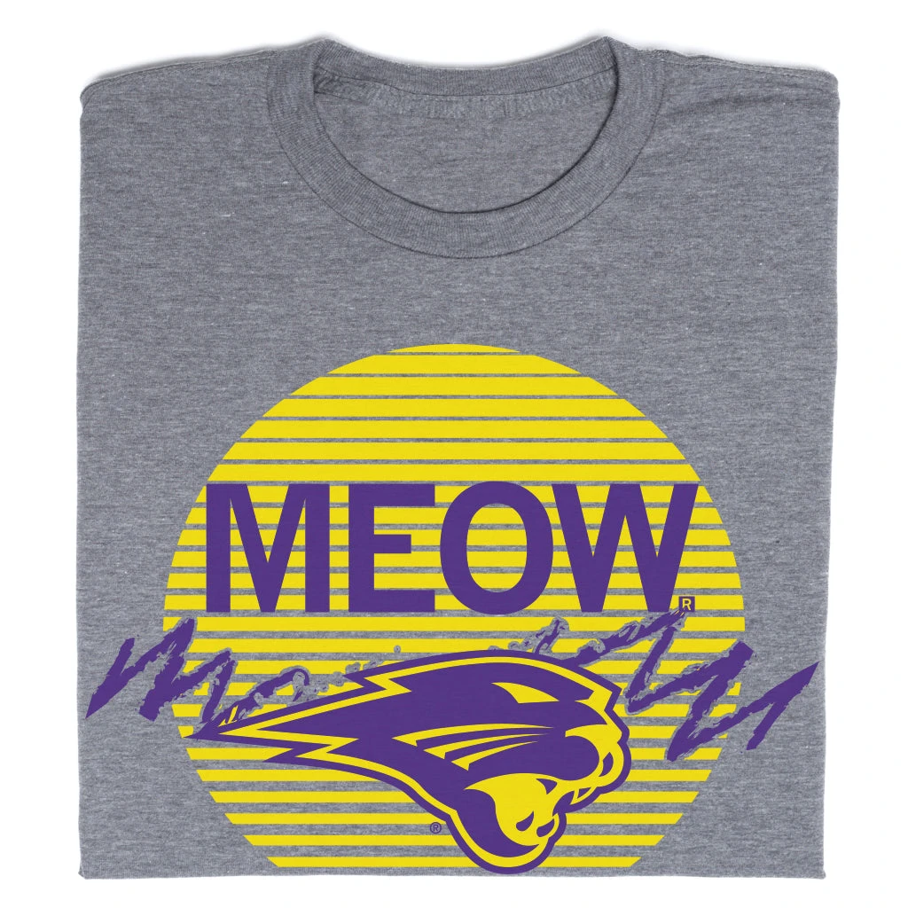 Panthers go Meow. A Portion of All RAYGUN Sales Raise Money For Organizations That We Support. Gold and Deep Purple Screen Print on a Heather Grey T-Shirt (65% Polyester / 35% Combed Ringspun Cotton). Cut & sewn sweatshop free. Designed and Printed by Union Labor at RAYGUN.
