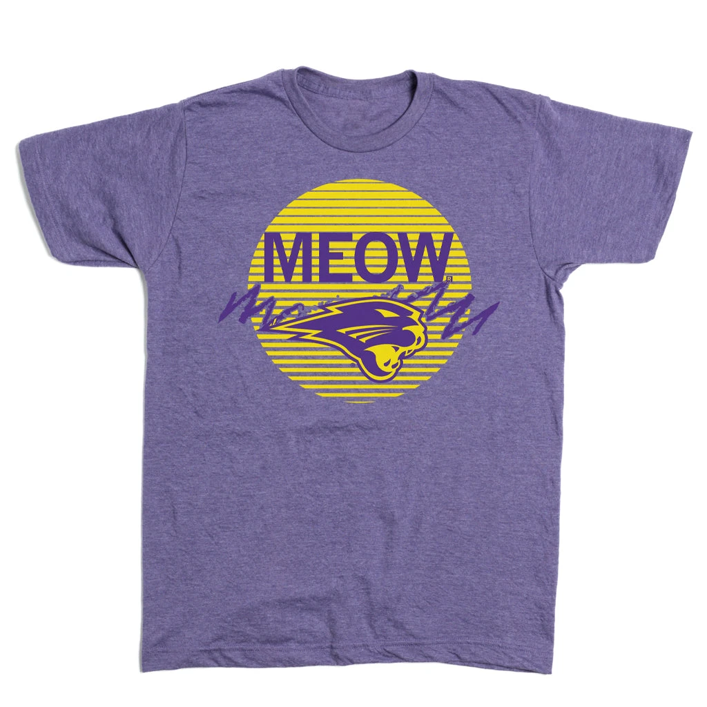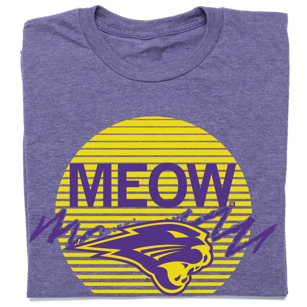Panthers go Meow. A Portion of All RAYGUN Sales Raise Money For Organizations That We Support. Gold and Deep Purple Screen Print on a Heather Purple T-Shirt (Standard Sizes are 50% Combed Ringspun Cotton / 50% Polyester). Cut & sewn sweatshop free. Designed and Printed by Union Labor at RAYGUN.