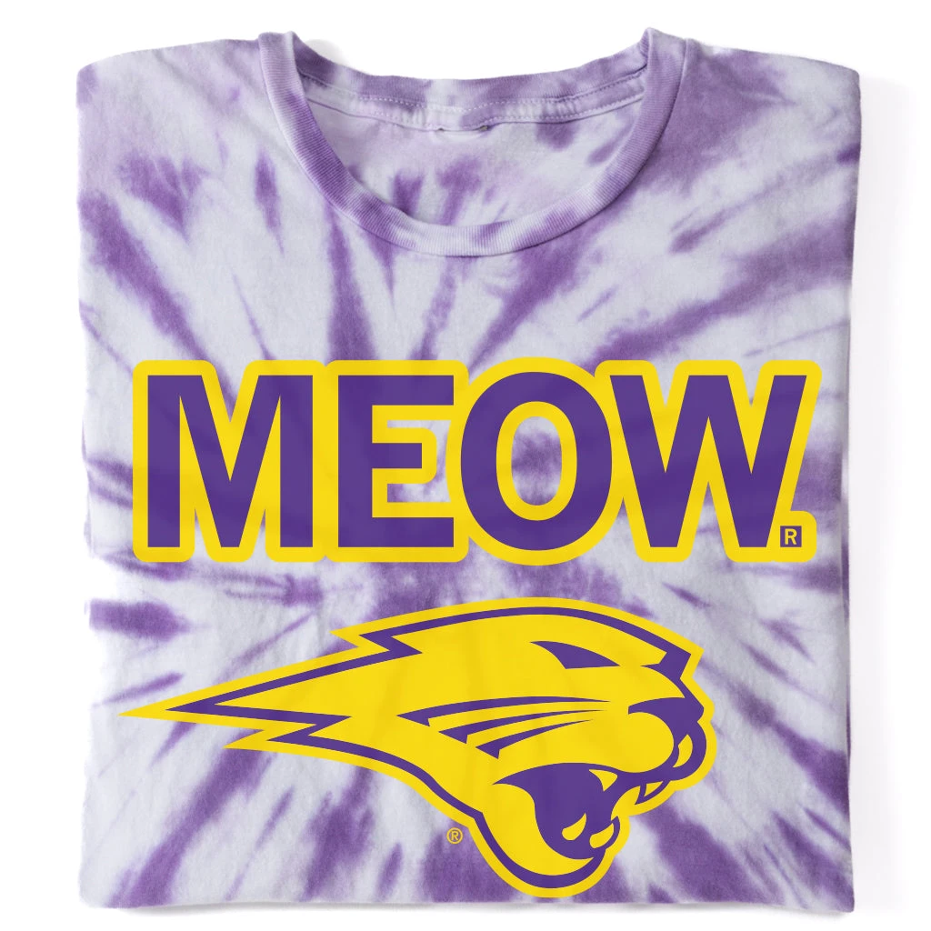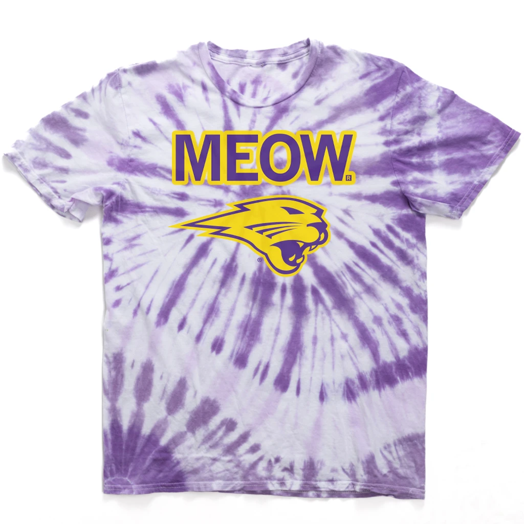 Panthers go Meow. A Portion of All RAYGUN Sales Raise Money For Organizations That We Support. Purple & Gold Screen Print on a Tie-Dyed T-shirt (100% Combed Ringspun Cotton). Cut & sewn sweatshop free. Designed and Printed by Union Labor at RAYGUN.