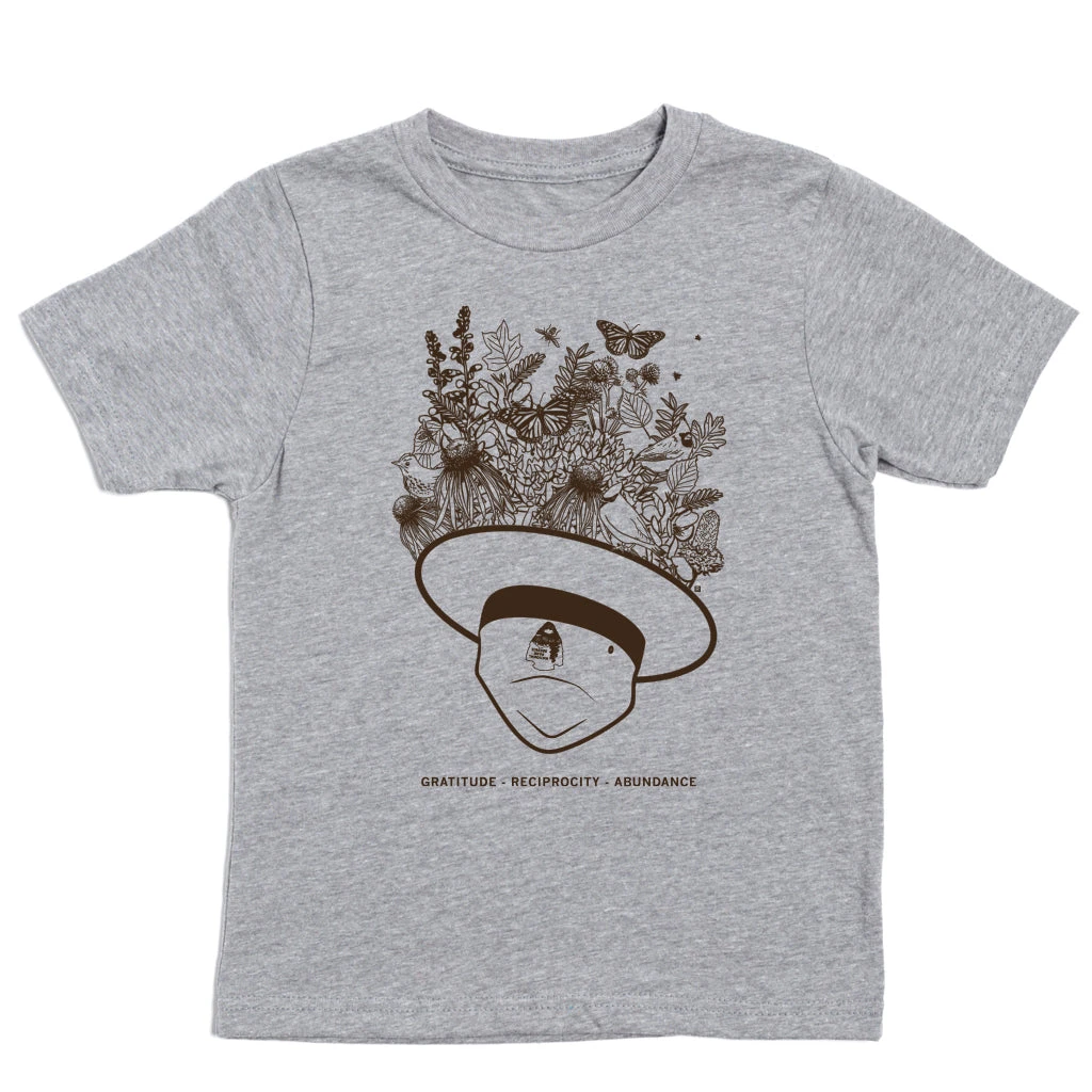 Gratitude – reciprocity – abundance. Inspired by Brian Gibbs himself. A Portion of All RAYGUN Sales Raise Money For Organizations That We Support. Sienna Brown Screen Print on a Heather Grey Shirt (90% Cotton / 10% Polyester). Cut and sewn sweatshop free. Designed and printed by Union Labor at RAYGUN.