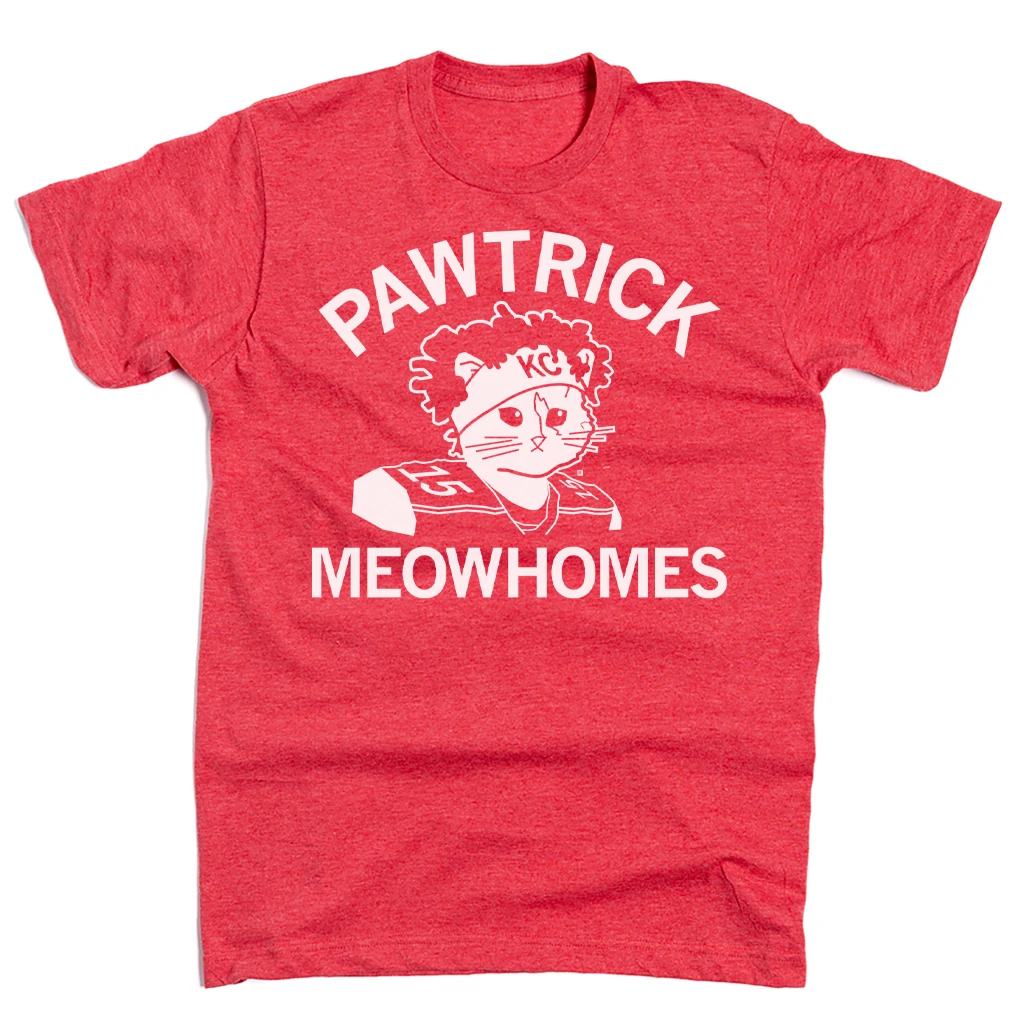 Pawtrick Meowhomes: cat got your Lombardi? A Portion of All Raygun Sales Raise Money For Organizations That We Support. White Screen Print on a Heather Red T-shirt (50% Combed Ringspun Cotton / 50% Polyester). Cut and sewn sweatshop free. Designed and printed by Union Labor at RAYGUN.