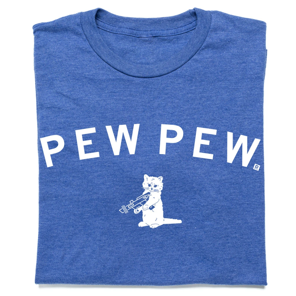Pew Pew. A Portion of All RAYGUN Sales Raise Money For Organizations That We Support. White Screen Print on a Heather Royal T-shirt (50% Combed Ringspun Cotton / 50% Polyester). Cut & sewn sweatshop free. Designed and Printed by Union Labor at RAYGUN.