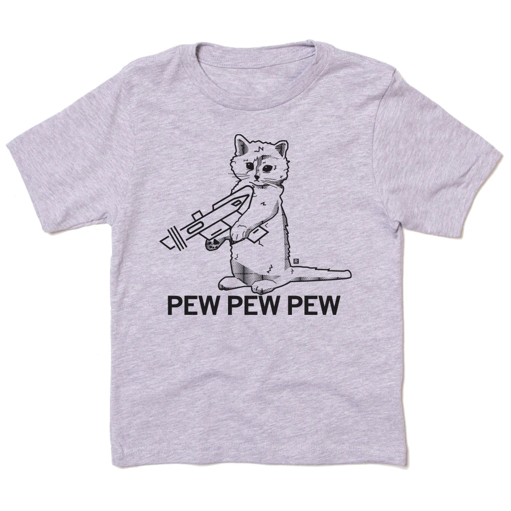 Gary the Cat Goes Pew Pew Pew. A Portion of All RAYGUN Sales Raise Money For Organizations That We Support. Black Screen Print on a Heather Grey Shirt (90% Cotton / 10% Polyester). Cut and sewn sweatshop free. Designed and printed by Union Labor at RAYGUN.