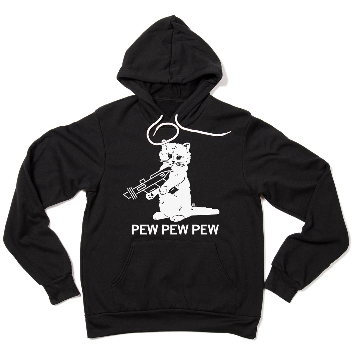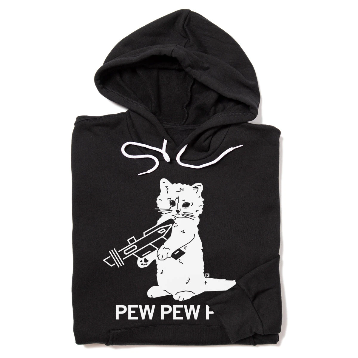 Pew Pew Pew! A Portion of All RAYGUN Sales Raise Money For Organizations That We Support. White Screen Print on a Black Pullover Hoodie (80% Combed and Ringspun Cotton / 20% Polyester). Cut and sewn sweatshop free. Designed and printed by Union Labor at RAYGUN.