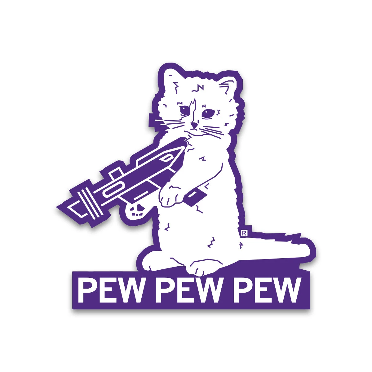 White & Purple Outline Pew Pew Pew Die-Cut. 6″ x 3″ Vinyl sticker. Designed by RAYGUN and printed by Sinclair Graphics in Des Moines, IA.