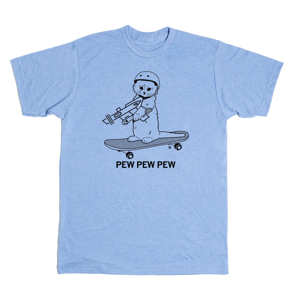 He was a skater cat. A Portion of All RAYGUN Sales Raise Money For Organizations That We Support. Black Screen Print on a Athletic Blue T-shirt (65% Polyester / 35% Combed Ringspun Cotton). Cut and sewn sweatshop free. Designed and printed by Union Labor at RAYGUN.