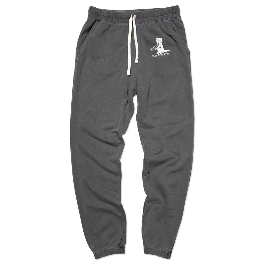 Pew Pew Pew. A Portion of All RAYGUN Sales Raise Money For Organizations That We Support. White Screen Print on Pepper Sweatpants (100% Combed Ringspun Cotton). Garment Dyed. Relaxed Fit. Jersey Lined Hand Pockets. Cut and sewn sweatshop free. Designed and printed by Union Labor at RAYGUN.