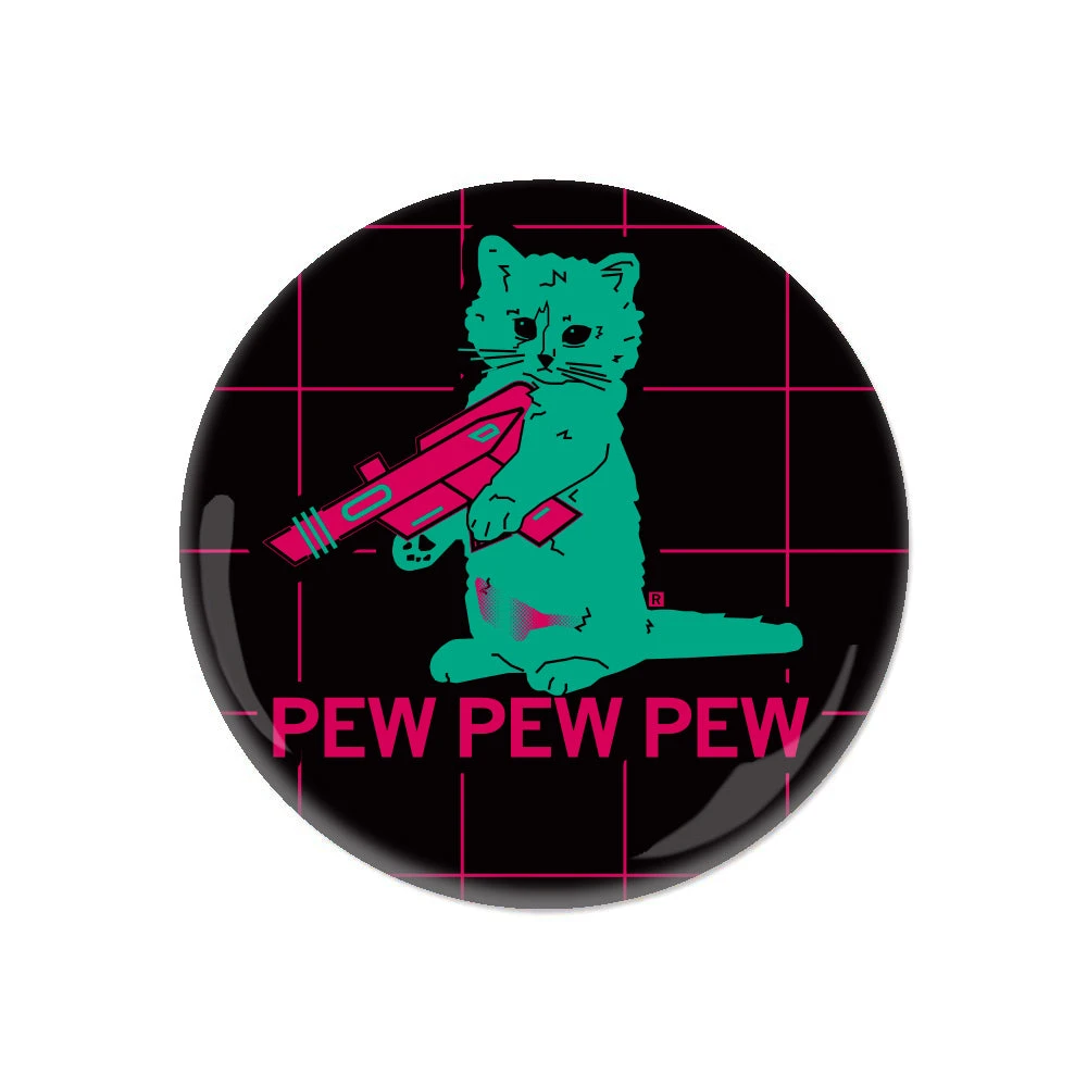 Gary the Cat goes pew pew pew. A Portion of All RAYGUN Sales Raise Money For Organizations That We Support. 2.25″ Round Metal Button. Designed by RAYGUN and Made by Badge Bomb LLC.