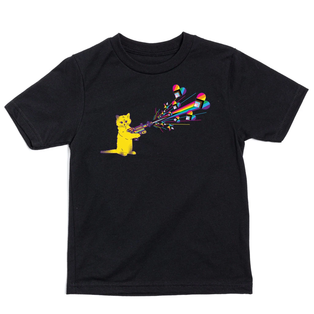 Gary the cat goes pew pew PRIDE! A Portion of All RAYGUN Sales Raise Money For Organizations That We Support. Heat Transfer on a Black T-Shirt (100% Combed Ringspun Cotton). Cut and sewn sweatshop free. Designed and printed by Union Labor at RAYGUN.
