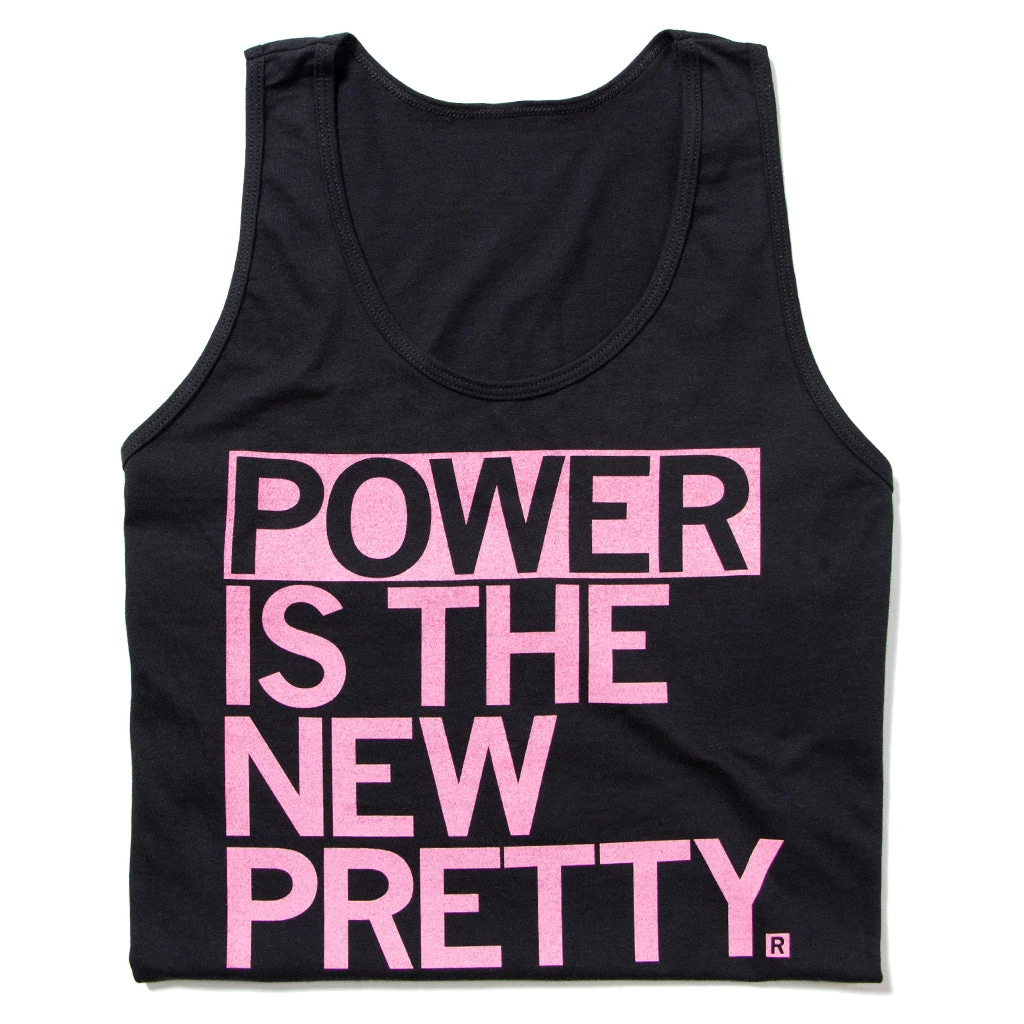 Power Is The New Pretty. Pink Screen Print on a Black Tank Top (100% Combed and Ringspun Cotton) Cut & sewn sweatshop-free. Designed & screen printed by union labor at RAYGUN.
