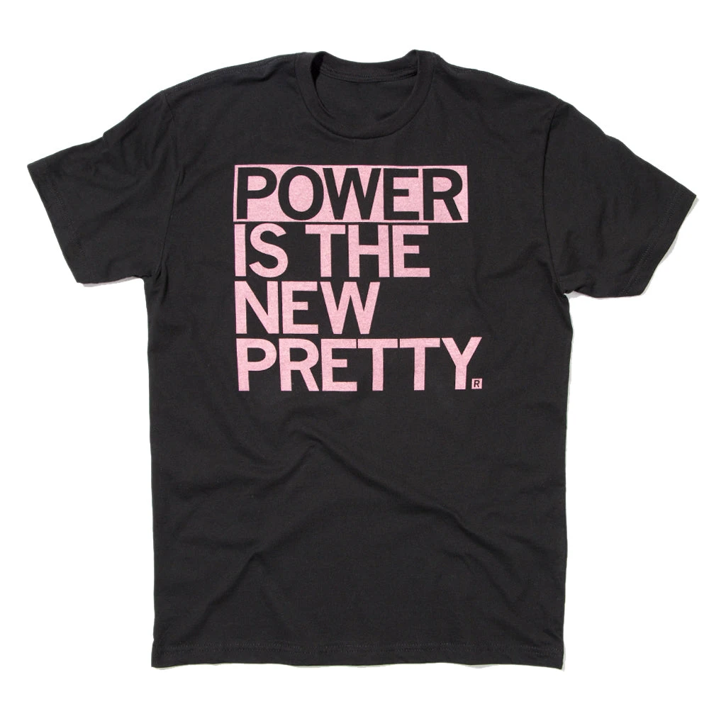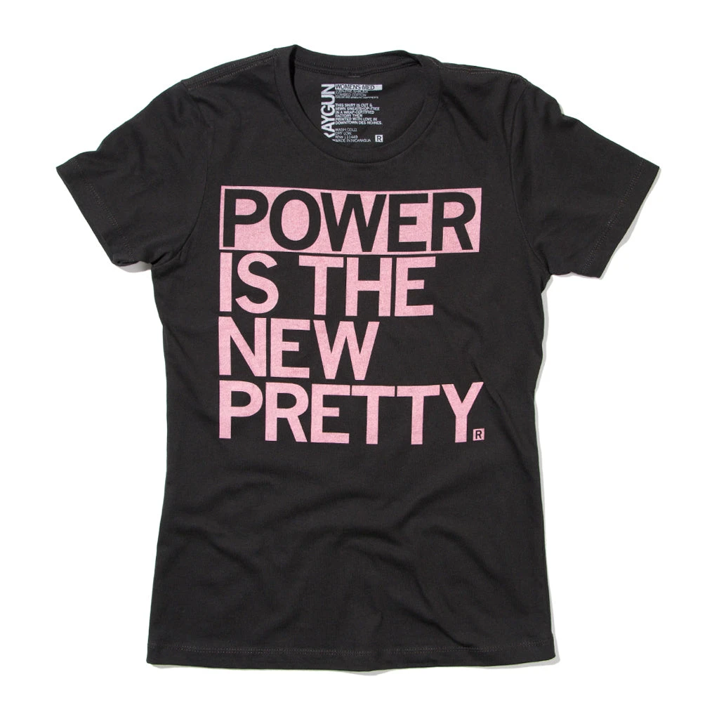 Power Is The New Pretty. A Portion of All RAYGUN Sales Raise Money For Organizations That We Support. Light Pink Screen Print on a Black T-shirt (100% Combed Ringspun Cotton). Cut and sewn sweatshop free. Designed and printed by Union Labor at RAYGUN.