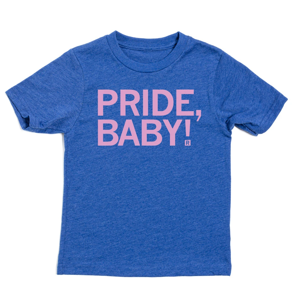 Pride, Baby! A Portion of All RAYGUN Sales Raise Money For Organizations That We Support. Pure Pink Screen Print on a Heather Royal Blue T-shirt (60% Polyester / 40% Combed Ringspun Cotton). Cut and sewn sweatshop free. Designed and printed by Union Labor at RAYGUN.