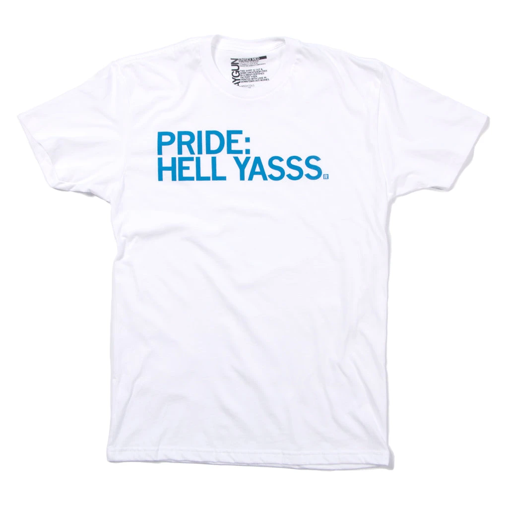 Pride: Hell Yasss. This Design Has Been Retired and is No Longer Available on Our Sales Floors But Can Be Ordered Here Online! Since All of Our Retired Designs Are Printed on Demand, Please Allow For a Couple Extra Days Before Shipping. A Portion of All Raygun Sales Raise Money For Organizations That We Support. Mono Blue Screen Print on a White T-shirt (100% Combed Ringspun Cotton) Cut & sewn sweatshop free. Designed & Printed by Union Labor at RAYGUN.
