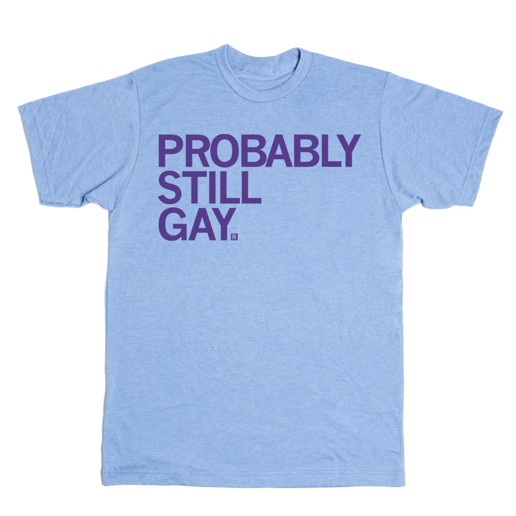 I’m Probably Still Gay. A Portion of All RAYGUN Sales Raise Money For Organizations That We Support. Purple Screen Print on a Athletic Blue T-shirt (65% Polyester / 35% Combed Ringspun Cotton). Cut and sewn sweatshop free. Designed and printed by Union Labor at RAYGUN.