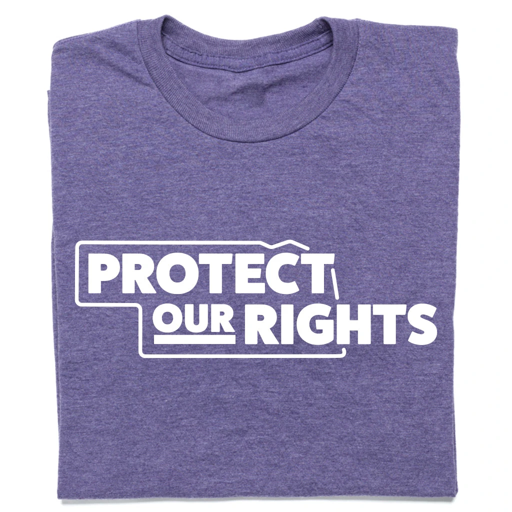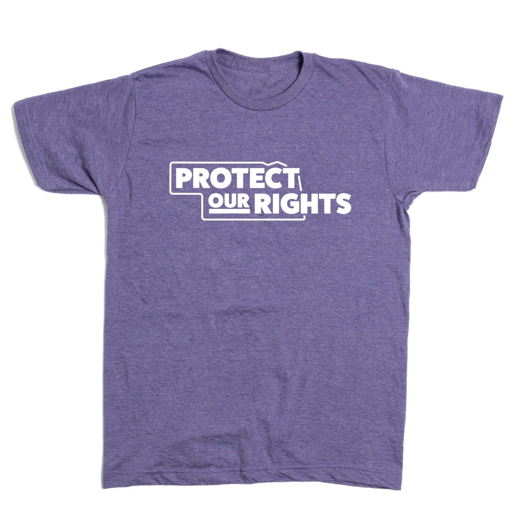 Nebraska: Protect Our Rights. This shirt is made with permission from Protect Our Rights. White Screen Print on a Heather Purple T-shirt (50% Combed Ringspun Cotton / 50% Polyester). Cut & sewn sweatshop free. Designed and Printed by Union Labor at RAYGUN.