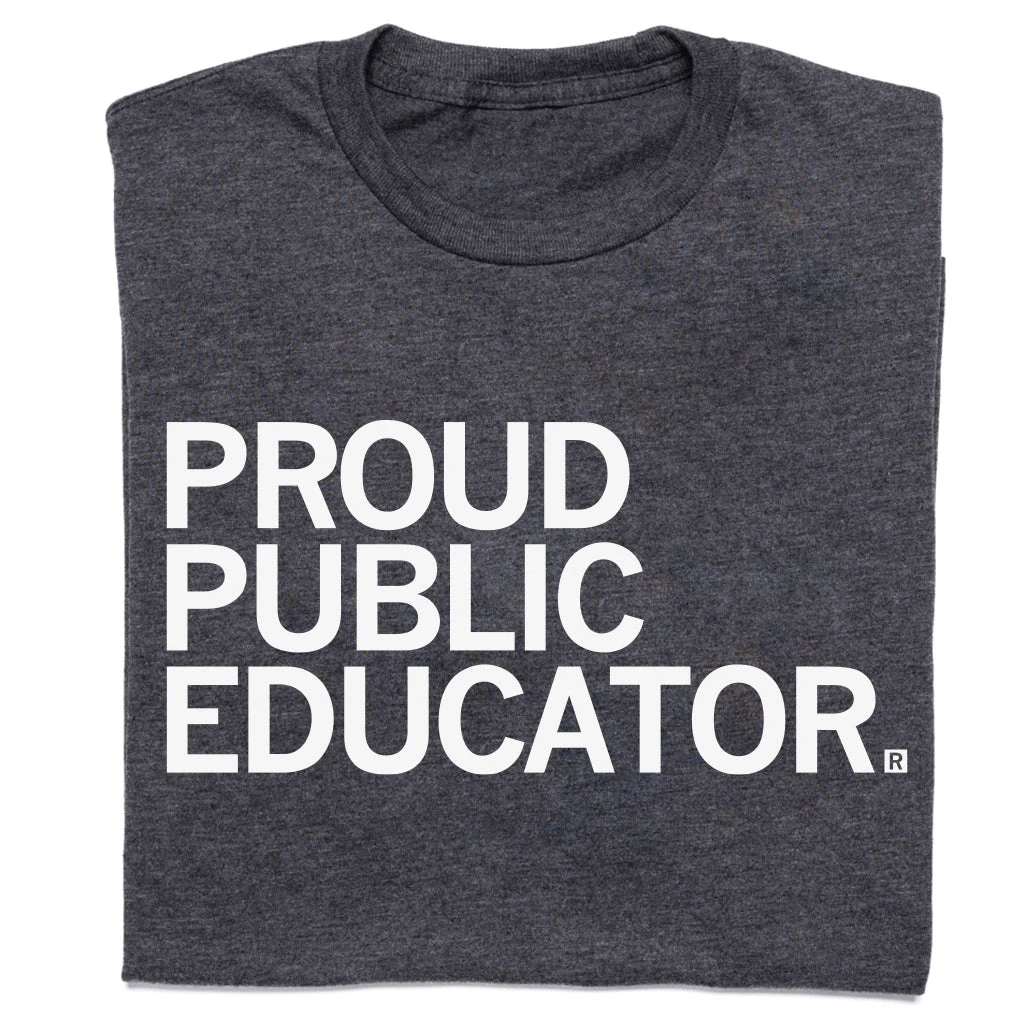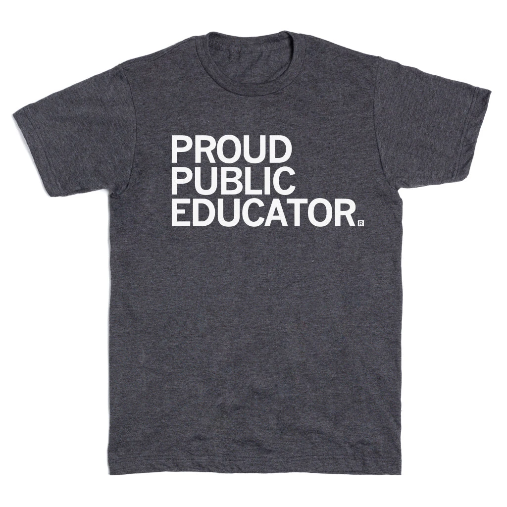 Proud Public Educator. A Portion of All Raygun Sales Raise Money For Organizations That We Support. White Screen Print on Charcoal T-shirt (50% Combed Ringspun Cotton / 50% Polyester). Cut and sewn sweatshop free. Designed and printed by Union Labor at RAYGUN.